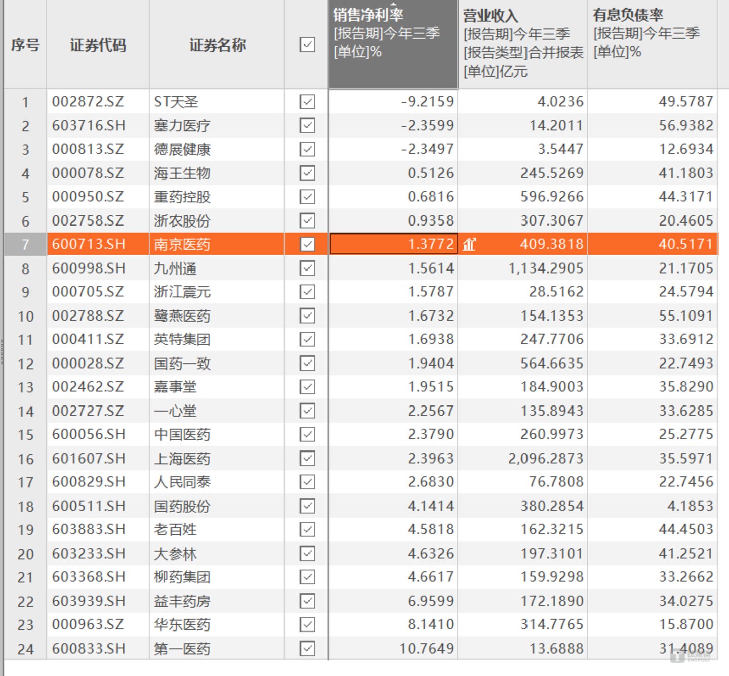 而对比南京医药的业绩,今年前三季度,公司实现营业总收入409.38亿元,同比增长0.97%,但归母净利润只有4.42亿元,同比增长0.36%。在整个医药流通行业中,南京医药的净利率处在倒数第7名的位置,南京医药规模效益并没有带来与其体量相对应的利润。