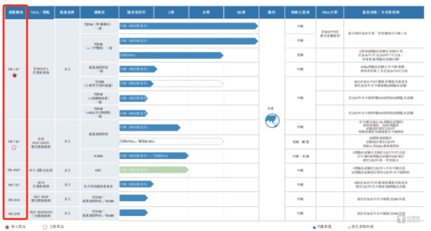 在时间和金钱的加持下,派格生物已自主开发一款核心产品及其他五款候选产品,用来占领包括2型糖尿病(「T2DM」)、肥胖症、非酒精性脂肪性肝炎(「NASH」)、阿片类药物引起的便秘(「OIC」,使用阿片类药物引起的胃肠道疾病)及先天性高胰岛素血症(一种罕见的内分泌疾病,患者持续出现低血糖症)等常见慢病及代谢疾病的市场机会。
