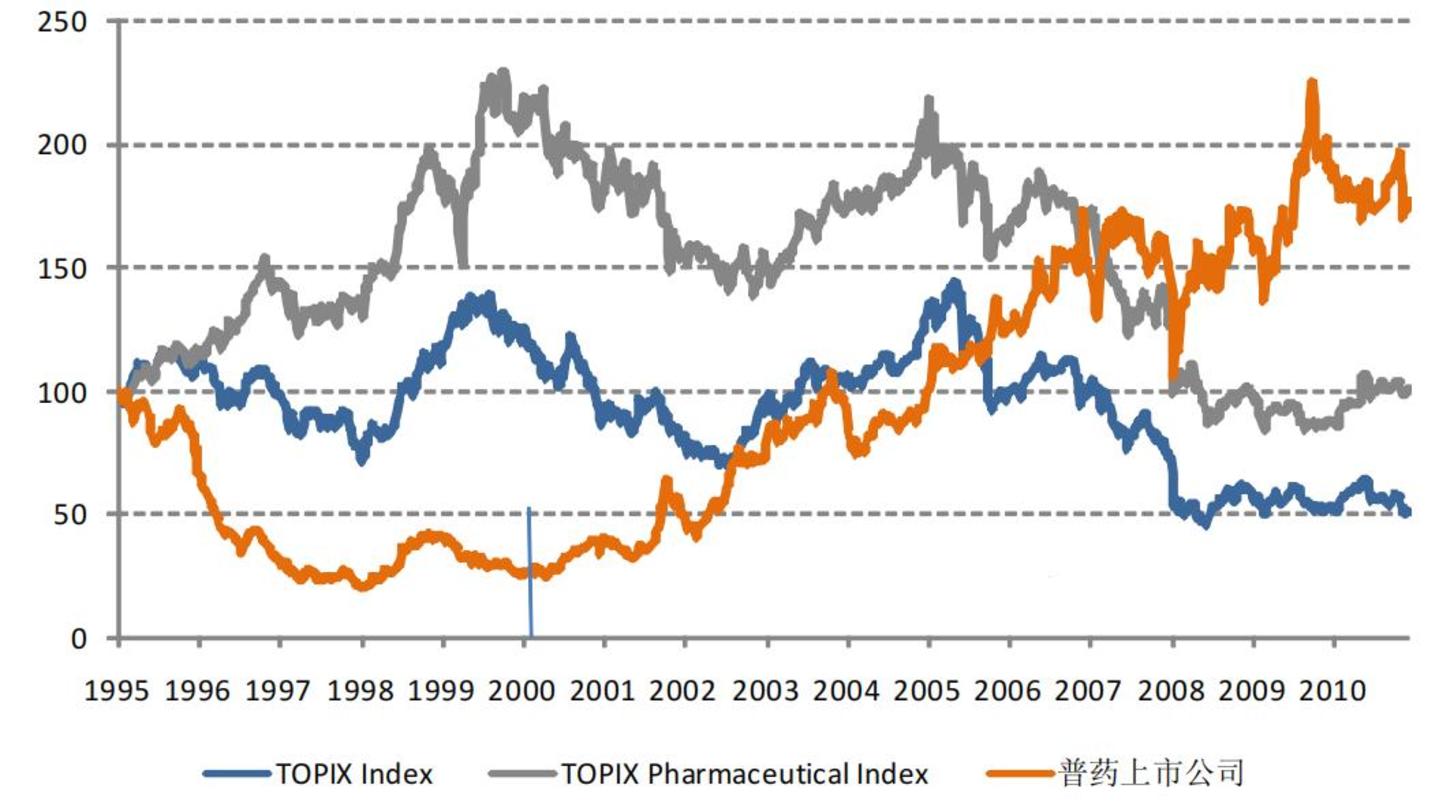 当然,全面控制药价带来的负面影响就是制药企业利润大幅下滑,这也导致日本医药公司在2000年之前的股价表现都是跑输大盘的,尤其是仿制药公司预期更是被打至谷底,很多公司都在1998年至2000年间创出股价历史新低。