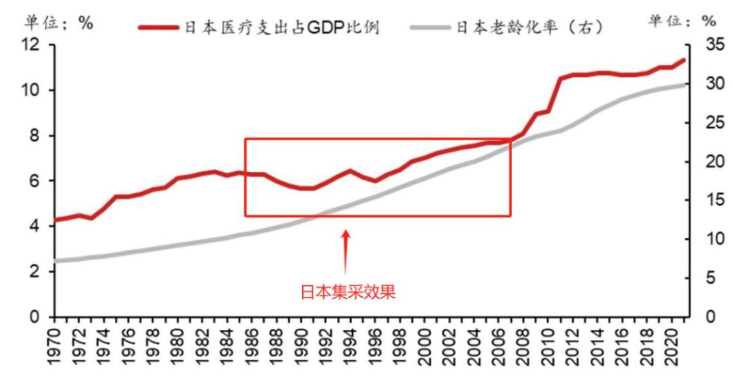 老龄化加剧仍在继续,医疗费用在GDP中的比重进一步增长几乎是确定的,为了减缓这一趋势,日本在1981年逐渐开始小规模药物集采尝试,并在1988年全面推行。从1988年开始,政府每两年进行一次对医保目录品种的价格调整,次平均降幅超过6%,这一集采制度一直延续至今。