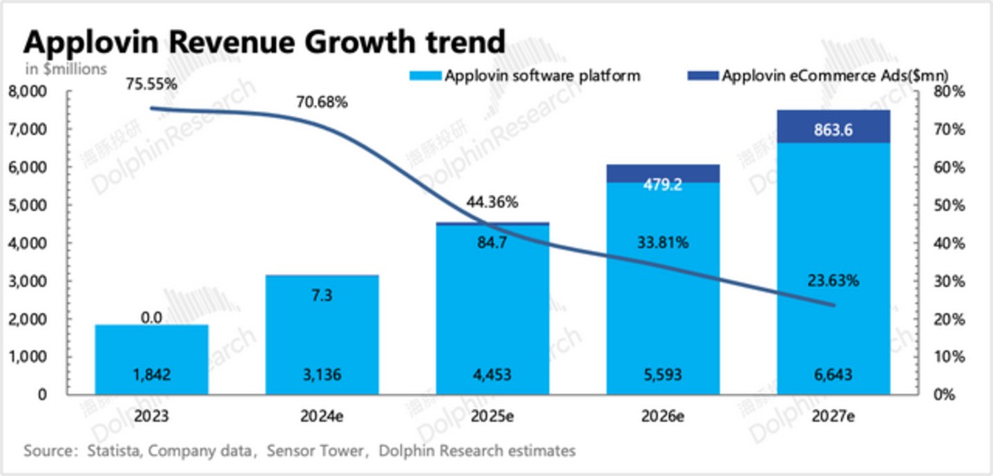 对照上文海豚君对游戏应用内广告流水的市场规模预期——2025-2027年CAGR14.6%,在Applovin通过收缩产业链条获得更高分成的趋势演绎下(直接对接买卖方,侵蚀其他SSP、DSP份额),App的软件平台收入未来三年要获得CAGR 20%以上的增长并非难事——海豚君预期未来三年软件服务收入CAGR能够达到33%,不含电商广告的收入预期为CAGR 28%。