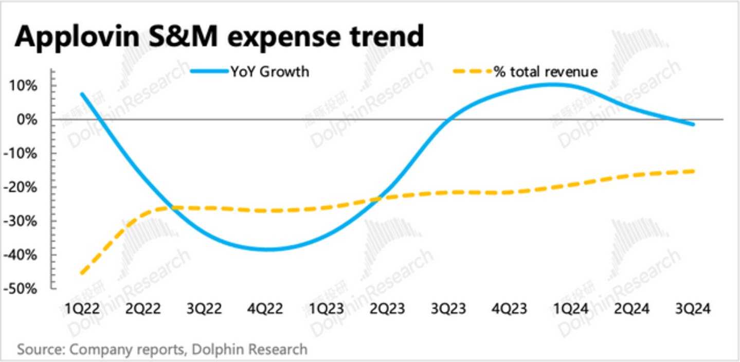 而像Unity等软件公司光一个销售费用在2021-2023年期间就干到了20%以上,这可能是与Applovin最大的差异点。Applovin在上市后,很快就开始了优化盈利的动作。其中,扩张过程中最容易同步增加的销售费用,Applovin反而开始了一路削减(也与关闭了部分游戏app的运营有关)。在2023年下半年收入大幅增长时,销售费用甚至也只有个位数增速。