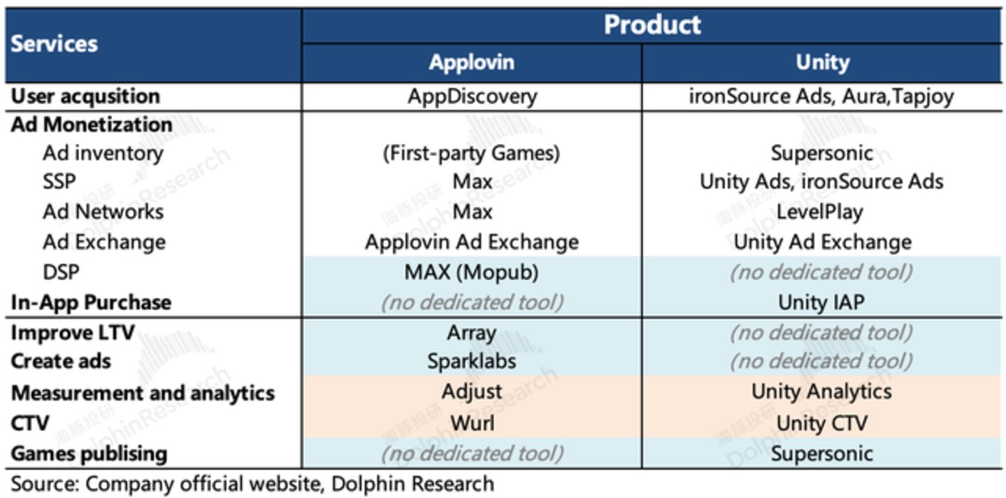 由上图可以看到,Unity的生态布局与Applovin的差异主要体现在: