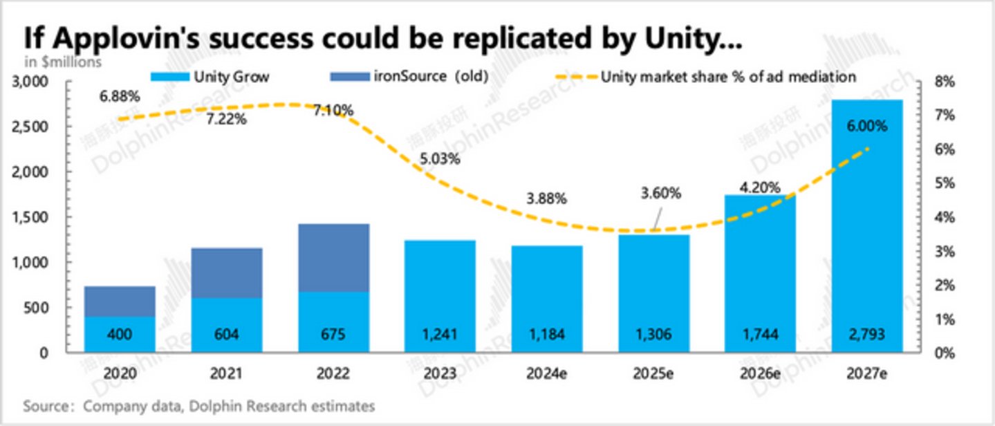 如果Unity的2026年是Applovin的2023年,那么从现在起的2-3年,在不考虑外延并购做高收入的情况下,假设能够同步实现Applovin从2020年2023年剔除收购公司收入之外,市占率提升的1-2pct。以及2027年全面加速恢复到2023年Unity+ironsource的合计市场份额6%(但距离曾经的巅峰7.2%还有一段距离)。