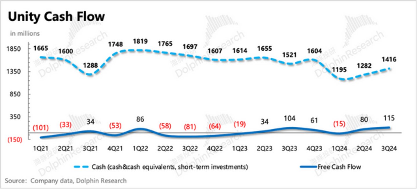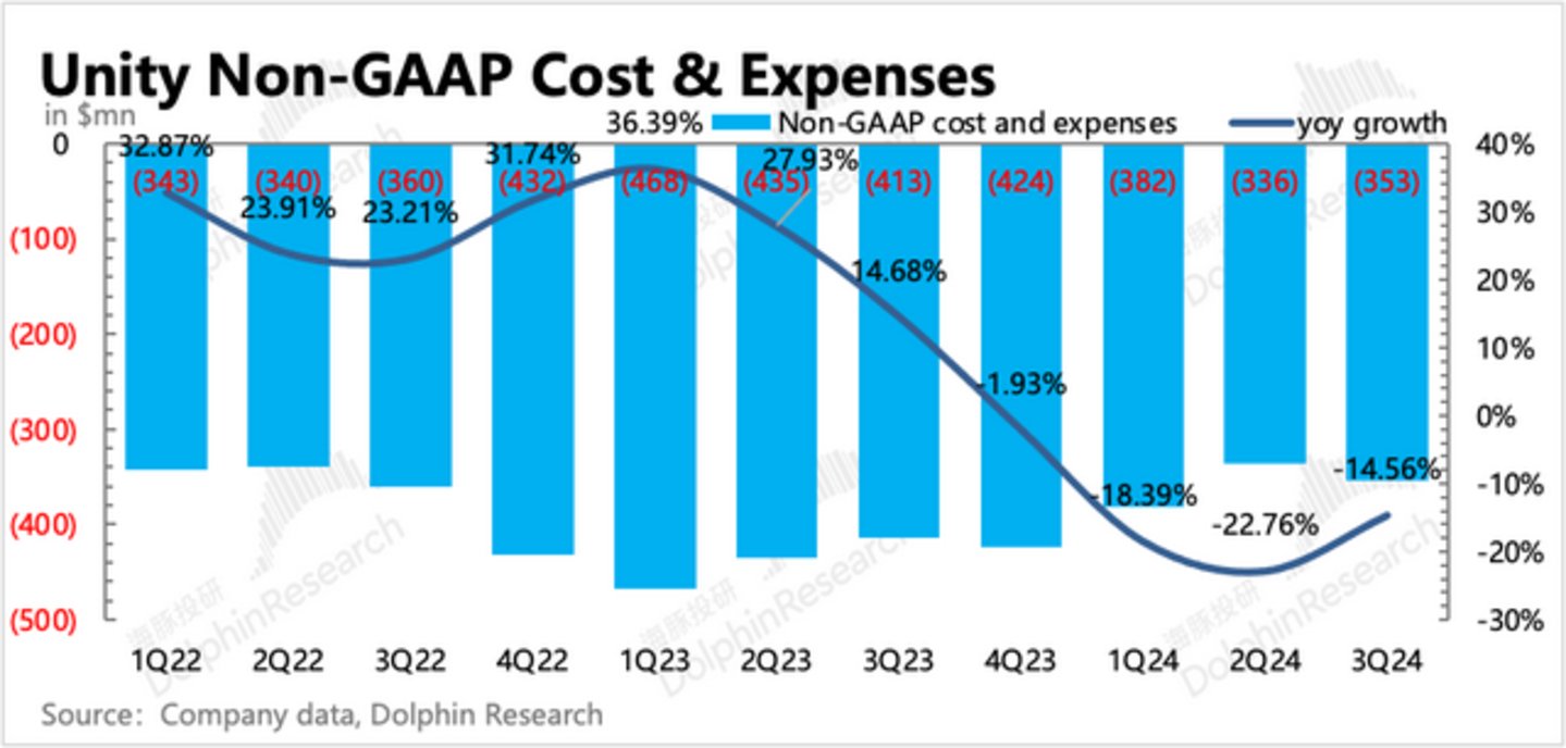 (2)其次是快速推进被延误了一年多的IronSource与Unity的并购整合,尤其是人员上相同业务线的重复岗位的简化,这个则体现在总雇员规模的收缩(较2023年底收缩了25%),Non-GAAP下经营三费绝对值的下降,以及自由现金流的同步改善。