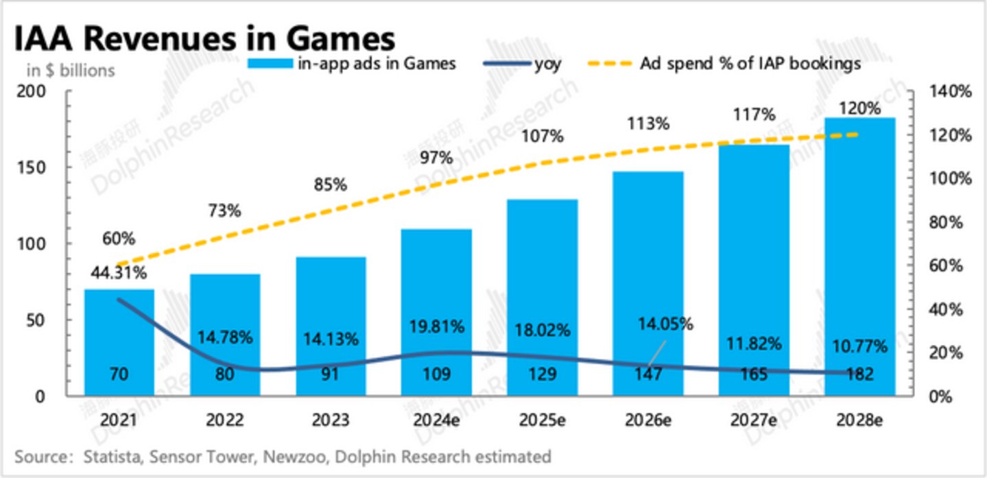 因此,海豚君预计未来2年游戏市场还将是IAA占比提升较快的时期,也就是会以高于IAP增速来实现增长。
