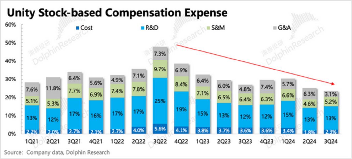 Unity对股东利益的不重视还体现在,自上市之后一直保持高位的股权激励费用。而同期的Applovin,就算是在两次临上市之前发的两笔股权激励,整体费用占收入的比重也没有超过15%。