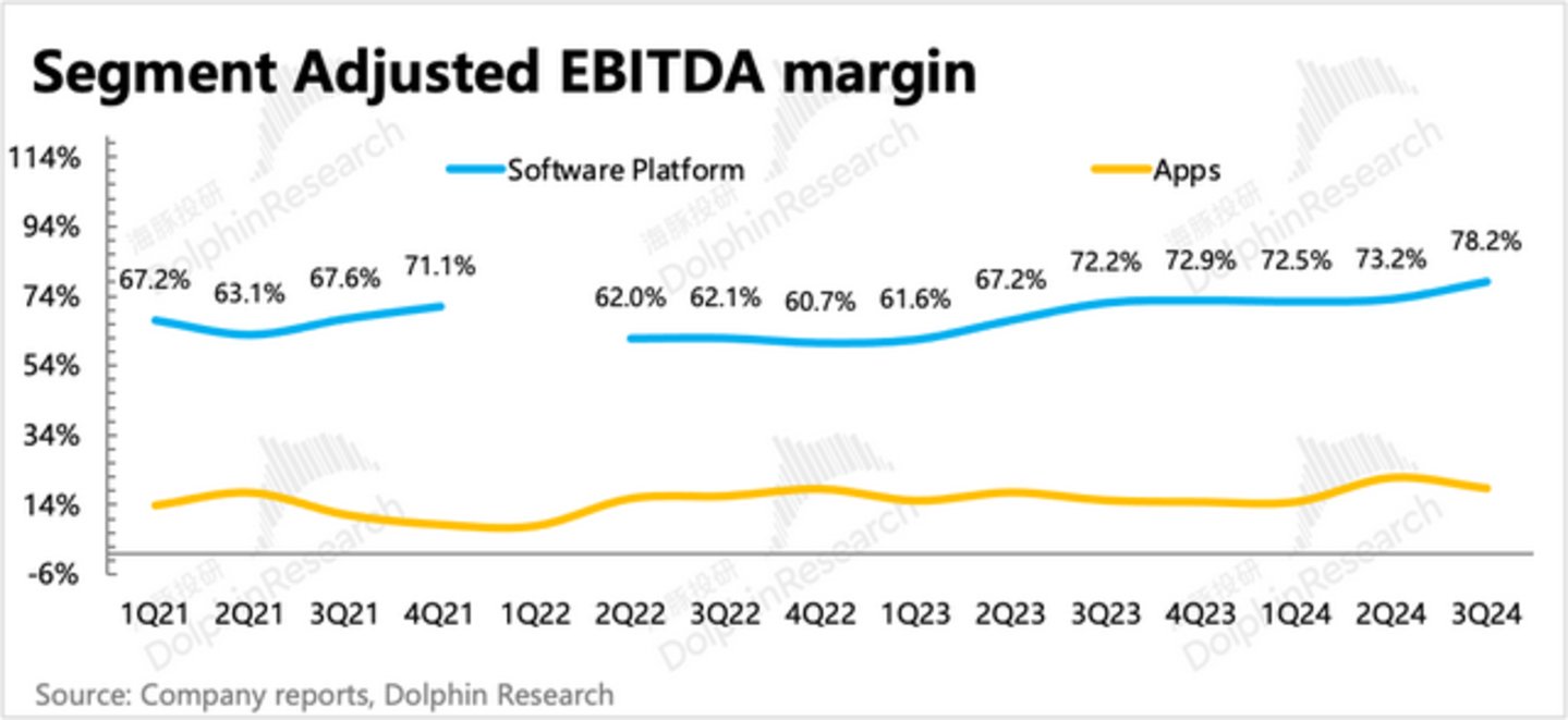 与同行相比,Applovin在广告业务上(Software platform)的经调整EBITDA或者说现金流比率非常高: