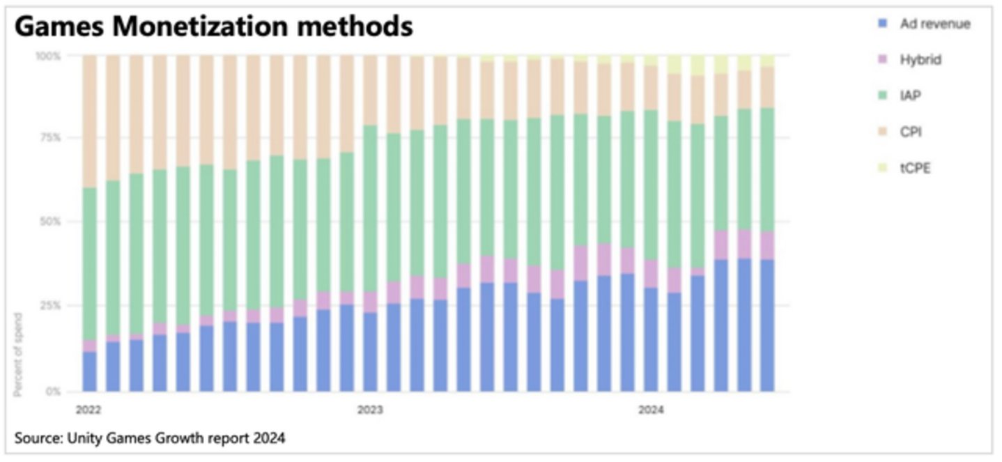 根据Statista和Sensor Tower的数据,2023年预估IAA收入已经占到了IAP收入的85%。2024年虽然IAP逐季回暖恢复增长,但以小游戏形式的休闲游戏又卷土重来(如中国的微信、抖音,海外的Facebook等),除此之外,更多的游戏开发商开始对IAA广告变现方式青睐有加,IAA能够帮助游戏开发商拓展更多的低付费玩家,通过广告来弥补付费上的价值缺口。