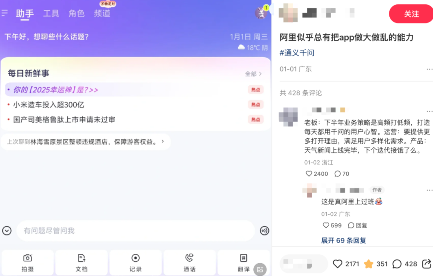 有用户在评论区戏谑道:“老板:下半年业务策略是高频打低频,打造每天都用千问的用户心智。运营:要提供更多打开理由,满足用户多样化需求。产品:天气新闻上线完毕,下个迭代接饿了么。”更有评论直言不讳:“这还是大模型吗,像垃圾桶,哪家大模型App长成这样?”