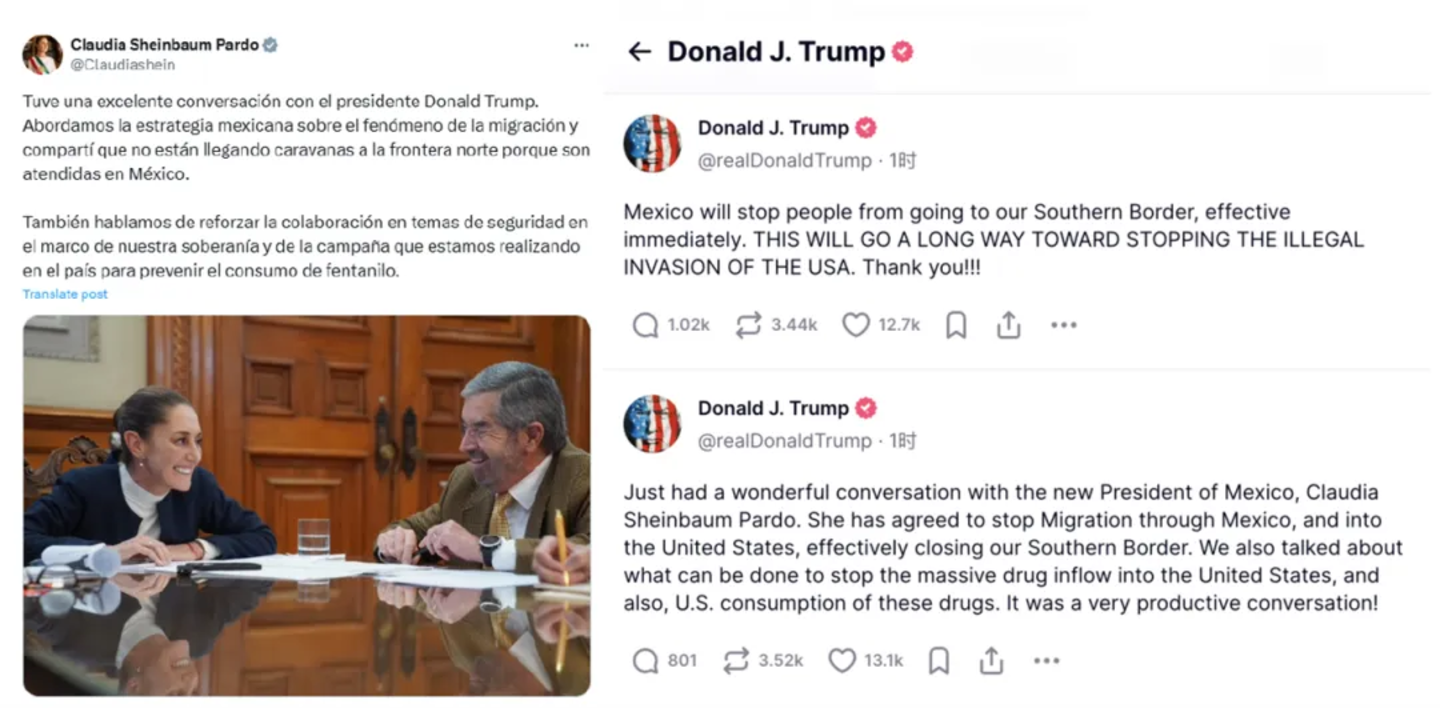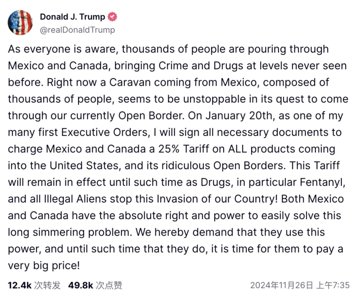 11月25日,已经成功赢得大选、成为候任总统的特朗普,在他旗下的社交平台Truth Social上宣称,上任第一天,他会“签署所有必要文件,向墨西哥和加拿大所有进入美国的产品征收25%关税。”在另一条动态中,他宣称还要对中国商品额外征收10%关税。