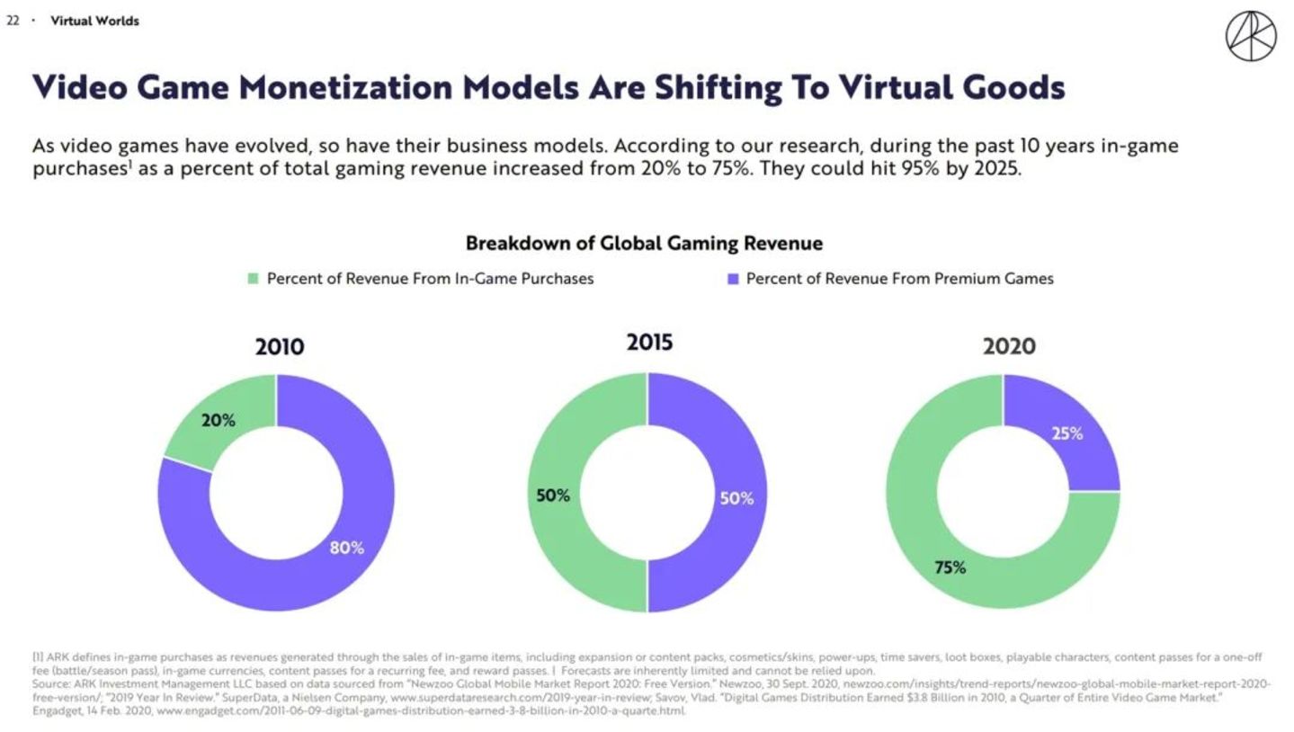 据 ARK Invest 2021 白皮书统计,过去十年,全球游戏收入中游戏内购收入从最初的 20% 提升至 75%,且占比还在不断提升,预计将于 2025 年达到 95%。