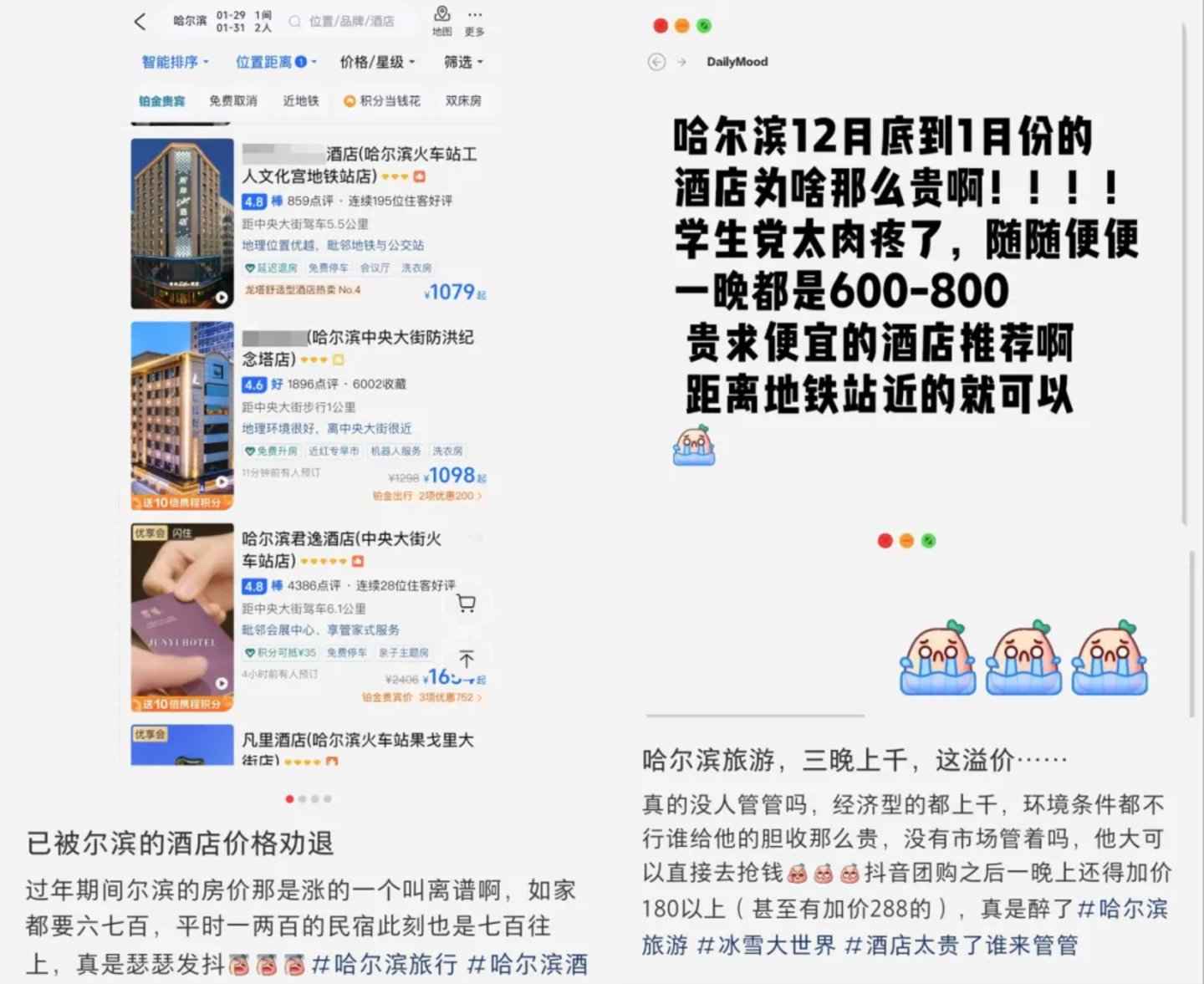 打开小红书,搜索“哈尔滨酒店”,前几页有不少内容都是在吐槽酒店涨价、已被劝退。