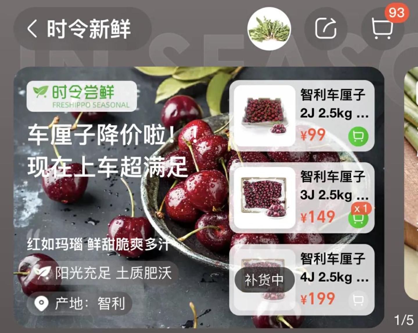 进入1月,5斤装的3J售价降到149元,4J降至199元,与去年同期相比均大幅下降。盒马车厘子采购苏伽表示,车厘子每日配送到全国各地门店,并持续补货。