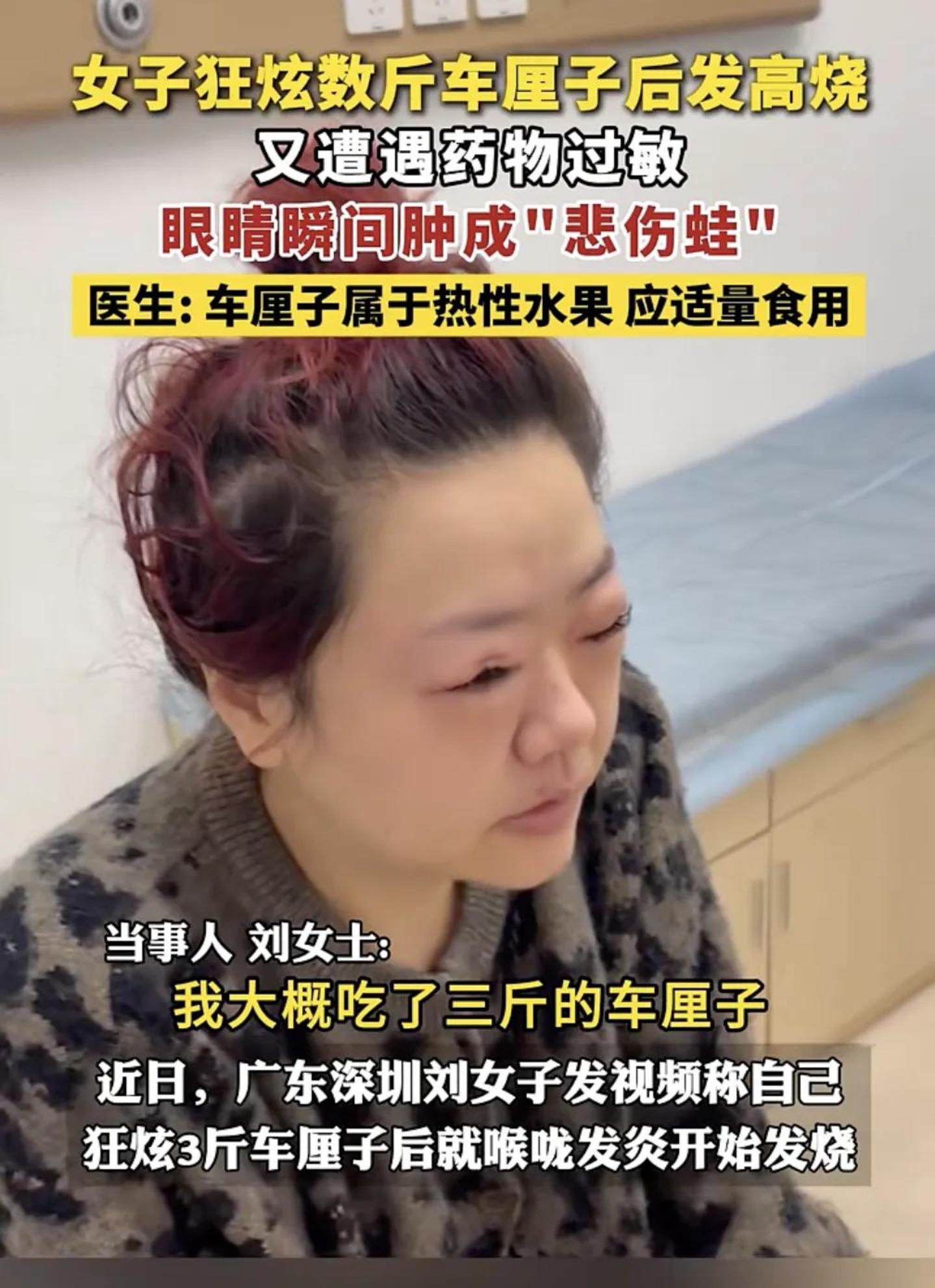 据媒体报道,广东一名女子,吃了3斤车厘子,可能太上火了,吃完就喉咙发炎开始发烧,随后药物过敏变成了“悲伤蛙”。她一度因为呼吸受阻,要到抢救室吸氧。“大家不要学我,现在只能戴墨镜去吃猪脚饭。”