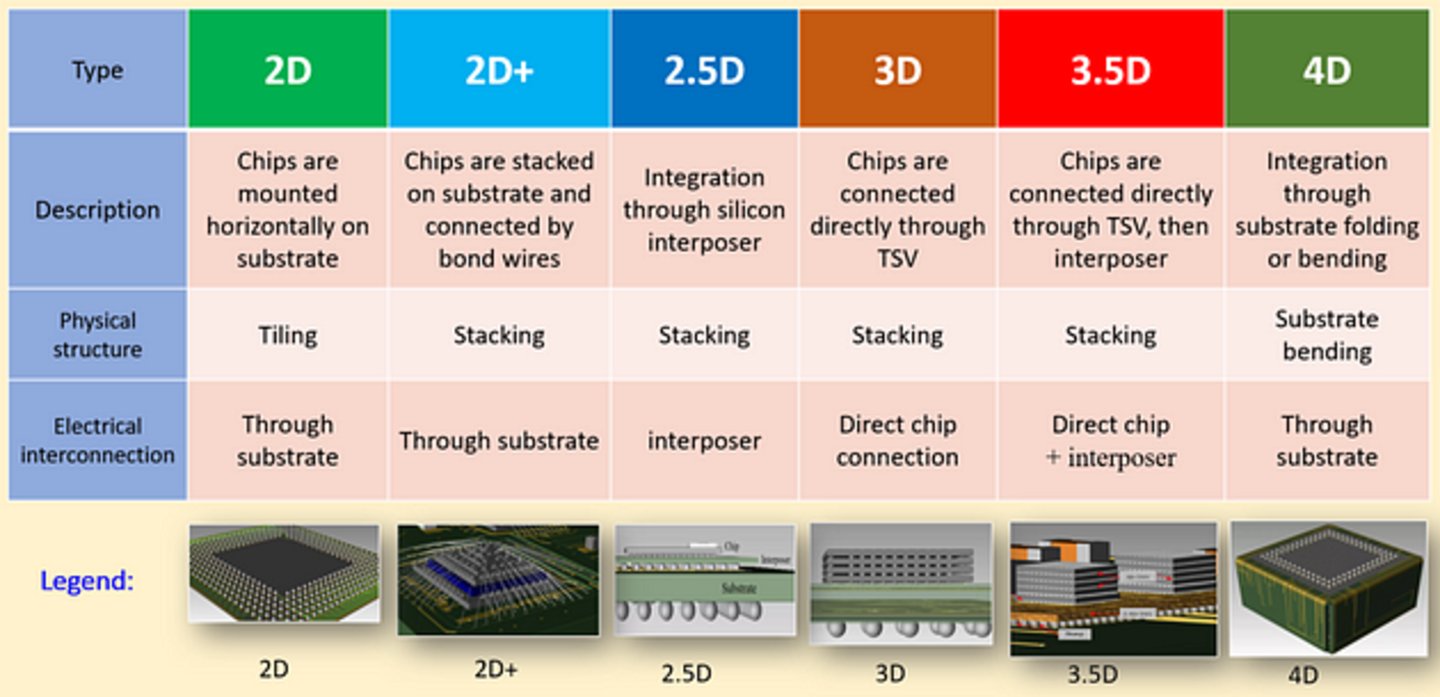 业内最先进的封装/集成技术正在从3D过渡到3.5D。3.5D技术包括了三维堆叠和平行的基于Interposer/封装基板扩展。理想情况下,3D IC是2D SoC的最佳扩展方案,但在实际设计中一些3D IC遇到了过于集中的散热挑战。因此结合了2.5D和3D架构的3.5D IC方案被研发出来,其本质是散热与集成度的折衷方案。