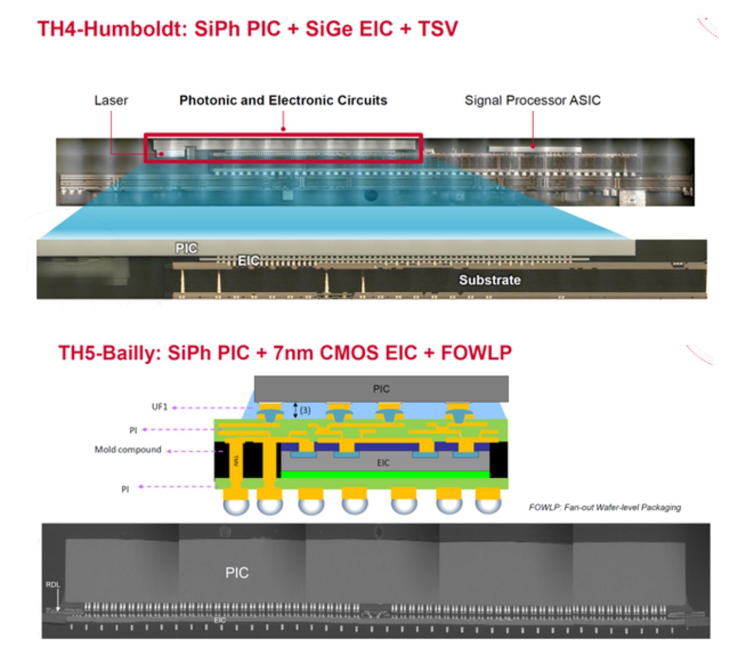 TH4-Humboldt等2.5D集成将 PIC(光学IC)和 EIC(电学IC)并排倒装放置在Interposer上,保持了类似于3D集成的互连性能和密度。TH5-Baily等3D集成将PIC放置在EIC之上,提供更高的互连密度,同时也会引入更复杂的热设计挑战。