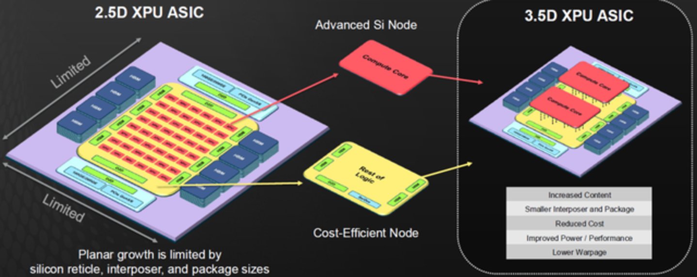 为了对抗工艺进步变缓带来的技术挑战。博通准备的方案是在原有2.5D方案基础之上堆叠计算核心的3.5D SiP技术。据传博通正为客户开发五种以上的 3.5D 产品,并将于2026 年2月开始生产发货。(消息来源:eenewseurope.com)