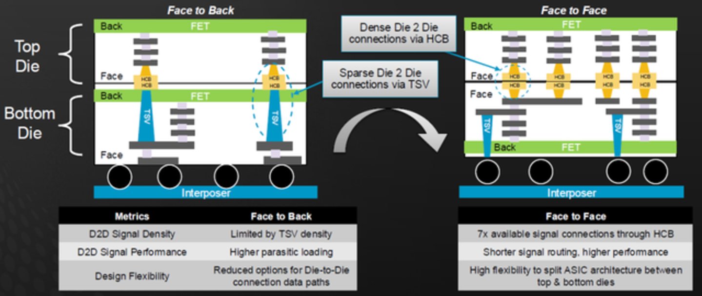 6)计算大核与逻辑Die通过Face to Face(Top Metal对Top Metal)方式进行键合。F2F的好处在于两个Die之间的高速互连无需通过TSV。
