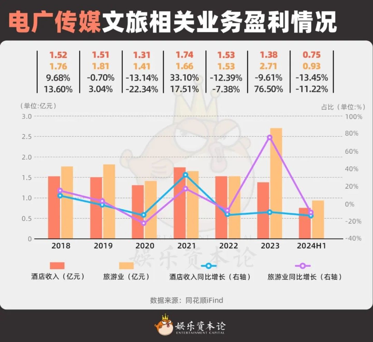 尽管恰好碰上疫情,但电广传媒的文旅业务在这几年来基本保持稳定。2023年,旅游业收入实现了亮眼的表现,但2024年上半年对比去年同期,增速略显平淡。