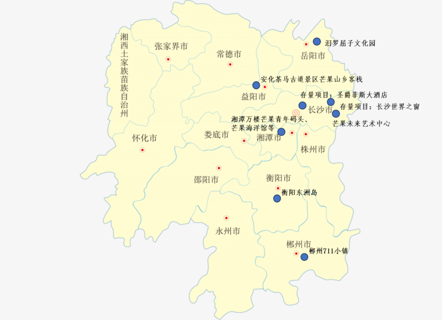从地理位置上看,这些项目以长沙为中心向外辐射。以湖南广电所在的马栏山为圆心,长沙市和湘潭市是电广传媒最重要的阵地,也集合了最优质的文旅项目。