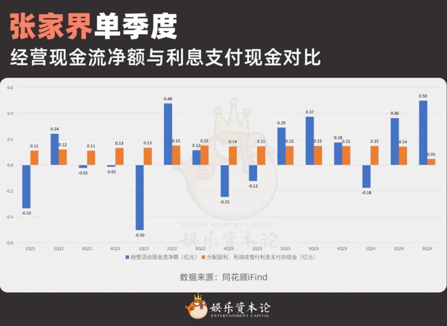 张家界单季度经营现金流净额与利息支付现金对比 数据来源:同花顺iFind