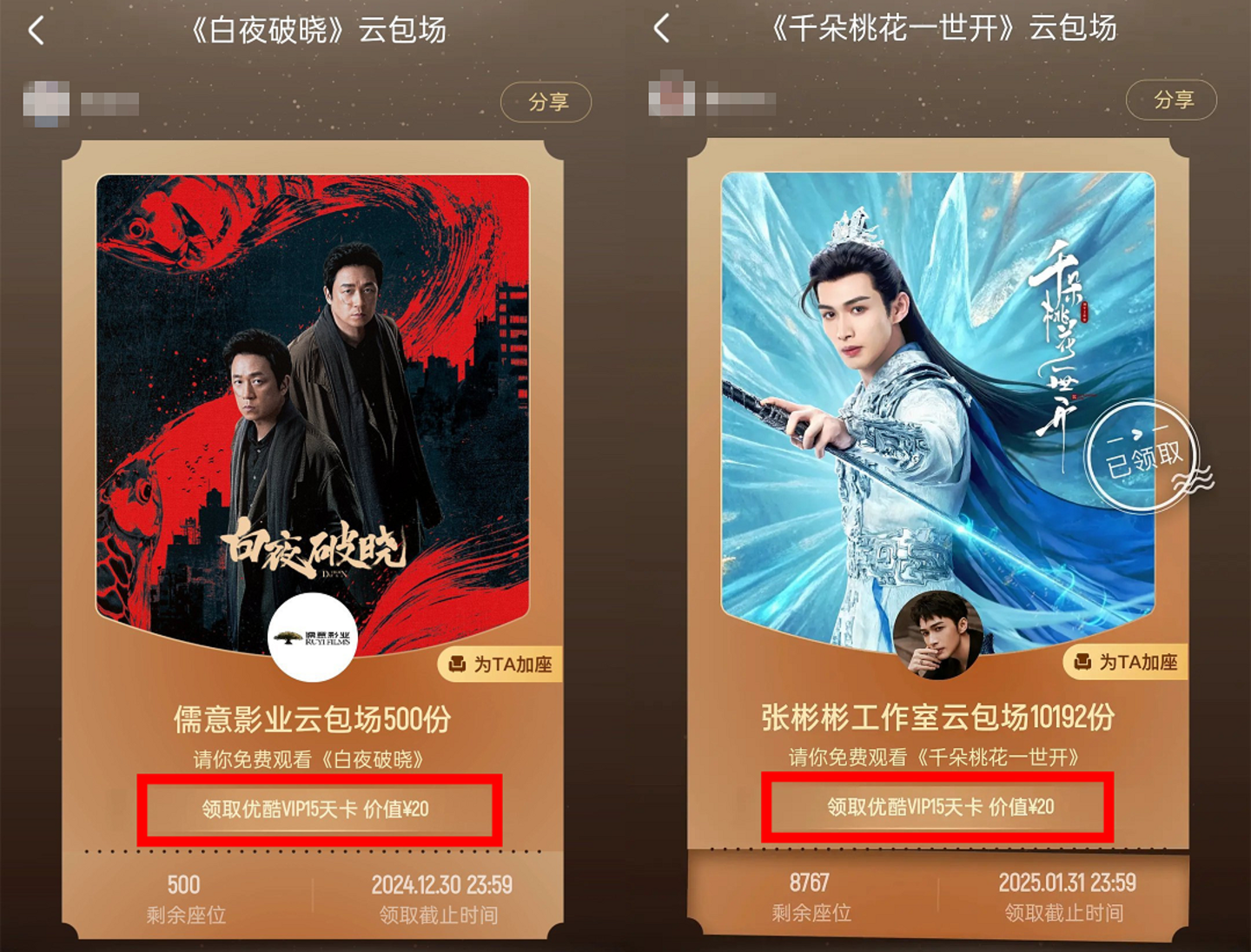 终于,疑似“卷不动”的优酷,从《白夜破晓》开始,首创“云包场15天会员卡”权益,将包场的单次金额从30元下降到了20元,附赠的会员权益从30天会员降至15天,最近播出的《清明上河图密码》《千朵桃花一世开》云包场都沿用此模式。