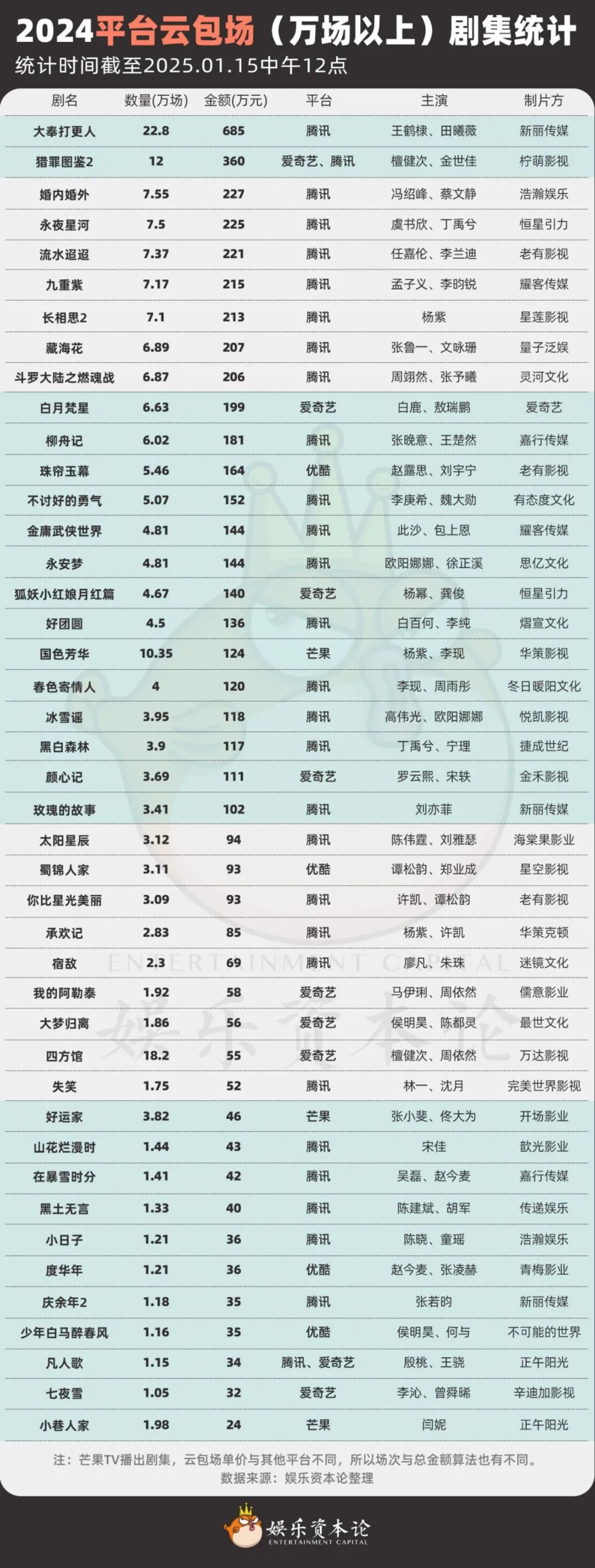 在2024年行至年末时,“云包场”愈发“卷”起来,每部剧包场份额越来越大,小娱统计了2024全年43部包场超过一万份剧集,其中有仅有10部开播日期在上半年,其它都为下半年开播作品。