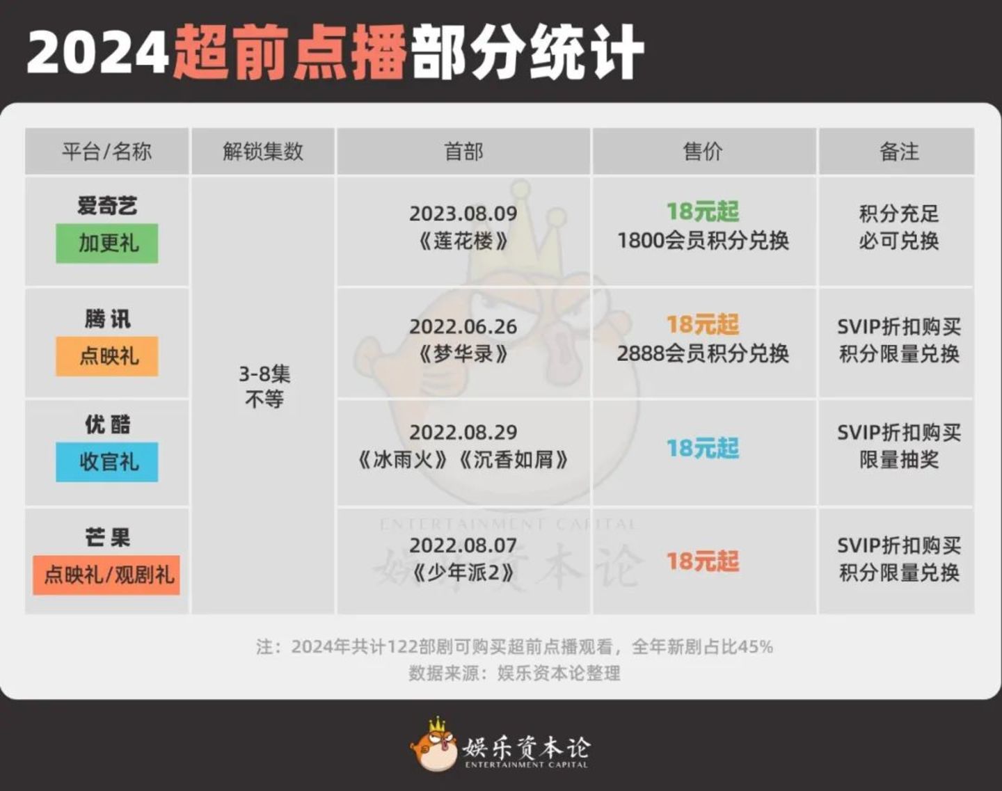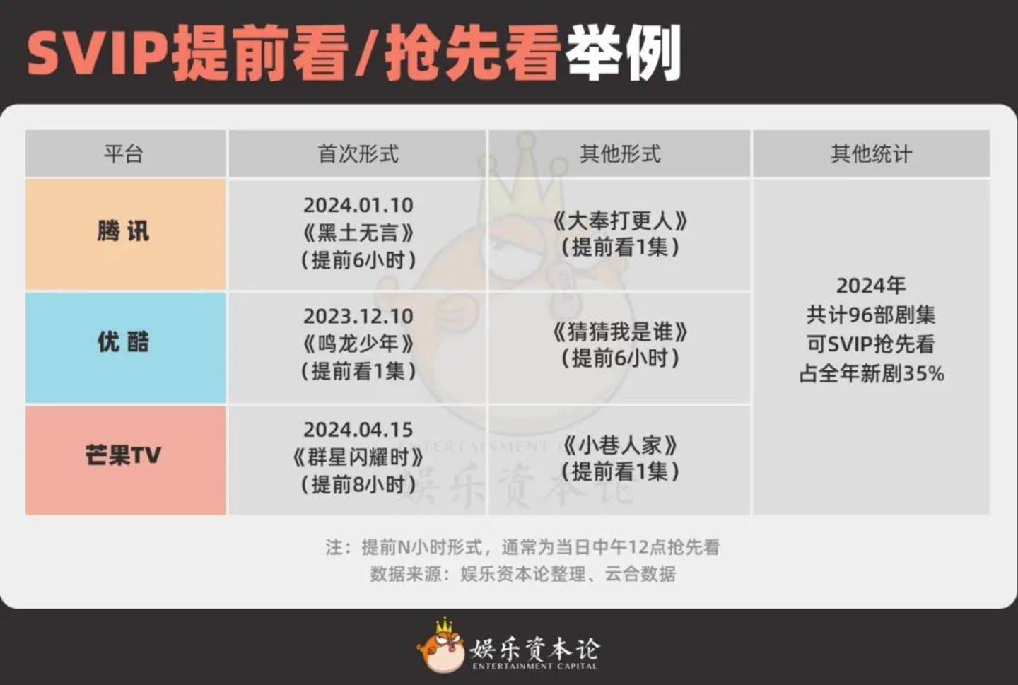 独家内容观看在2024年增加的服务中,其一是SVIP“抢先看”,除了爱奇艺仍未有这项服务外,腾讯、优酷、芒果TV从一年前陆续推出该服务,有部分剧集为SVIP中午12点可提前观看VIP晚间更新内容,但大部分都是SVIP可以提前一天观看VIP次日更新内容。
