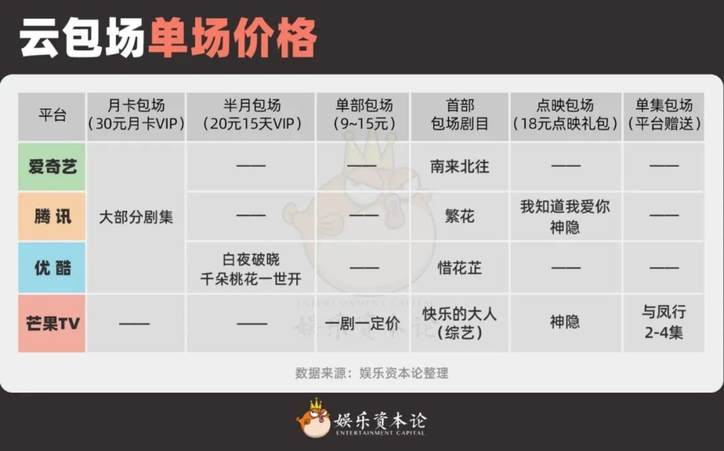 芒果TV的云包场实施“单剧限定”权益,价格从9元到15元/份不等,比如《国色芳华》包场价格为12元/份,包场10万份,价格相当于爱腾优包场4万份;《群星闪耀时》包场价格为9元/份,1万份仅需9万元;《以爱为营》的包场价格则为15元/份。