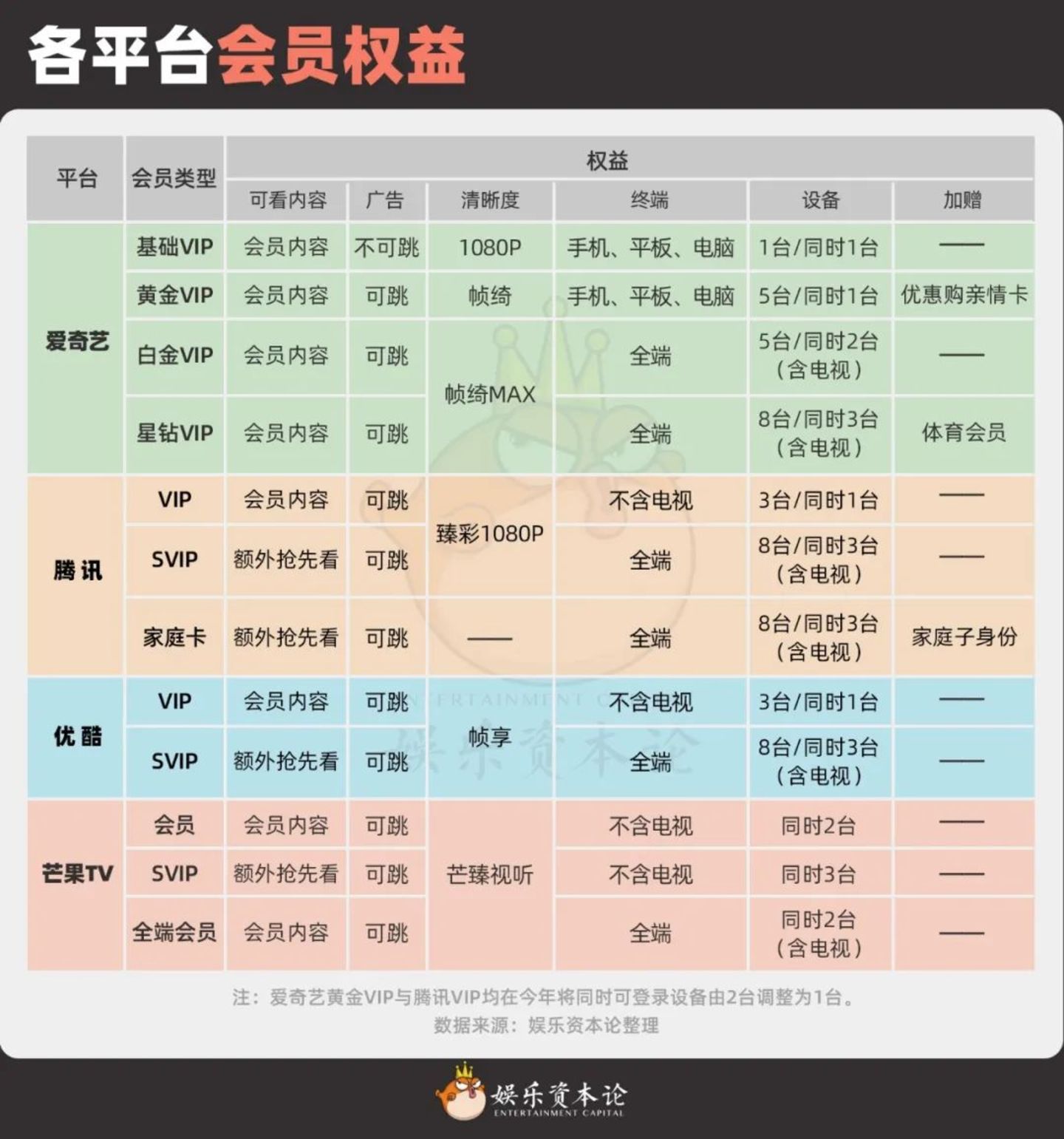 不过,在观看终端的权益上,腾讯视频一个月前做出权益调整,压缩了普通VIP可观看设备数,而SVIP则不变,也算是将更多权益让渡给SVIP。