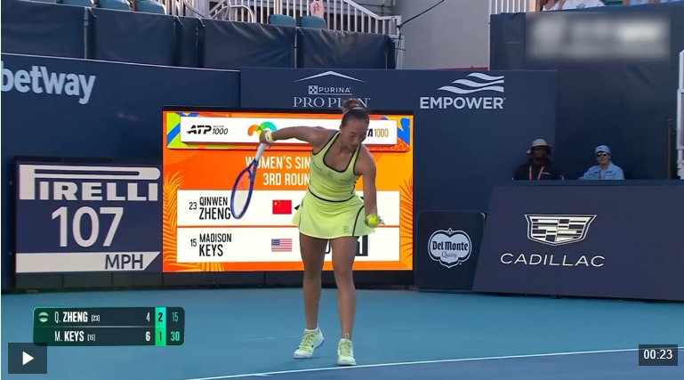 北京时间3月23日,WTA1000迈阿密赛第三轮,中国选手郑钦文在与前澳网冠军、美国选手凯斯的较量中,在4-6先丢一盘的情况下,以6-2、6-4连扳两盘,大比分2-1逆转凯斯,在本站连续淘汰两位大满贯冠军,职业生涯第三次闯入赛会16强。