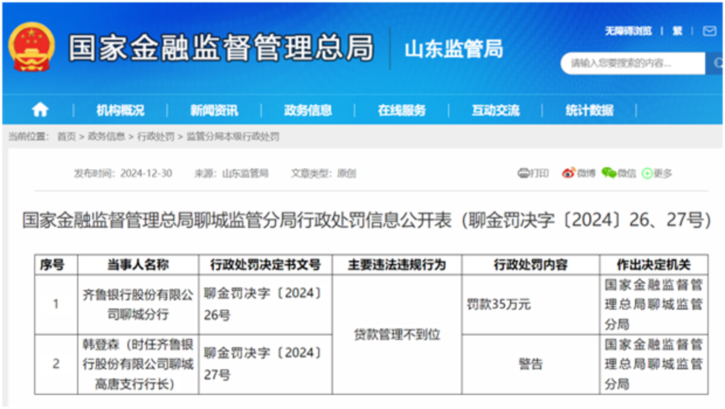 12月30日,国家金融监管总局聊城监管分局发布的行政处罚信息公开表显示,齐鲁银行聊城分行被查获“贷款管理不到位”的违法违规行为,被处以罚款35万元。