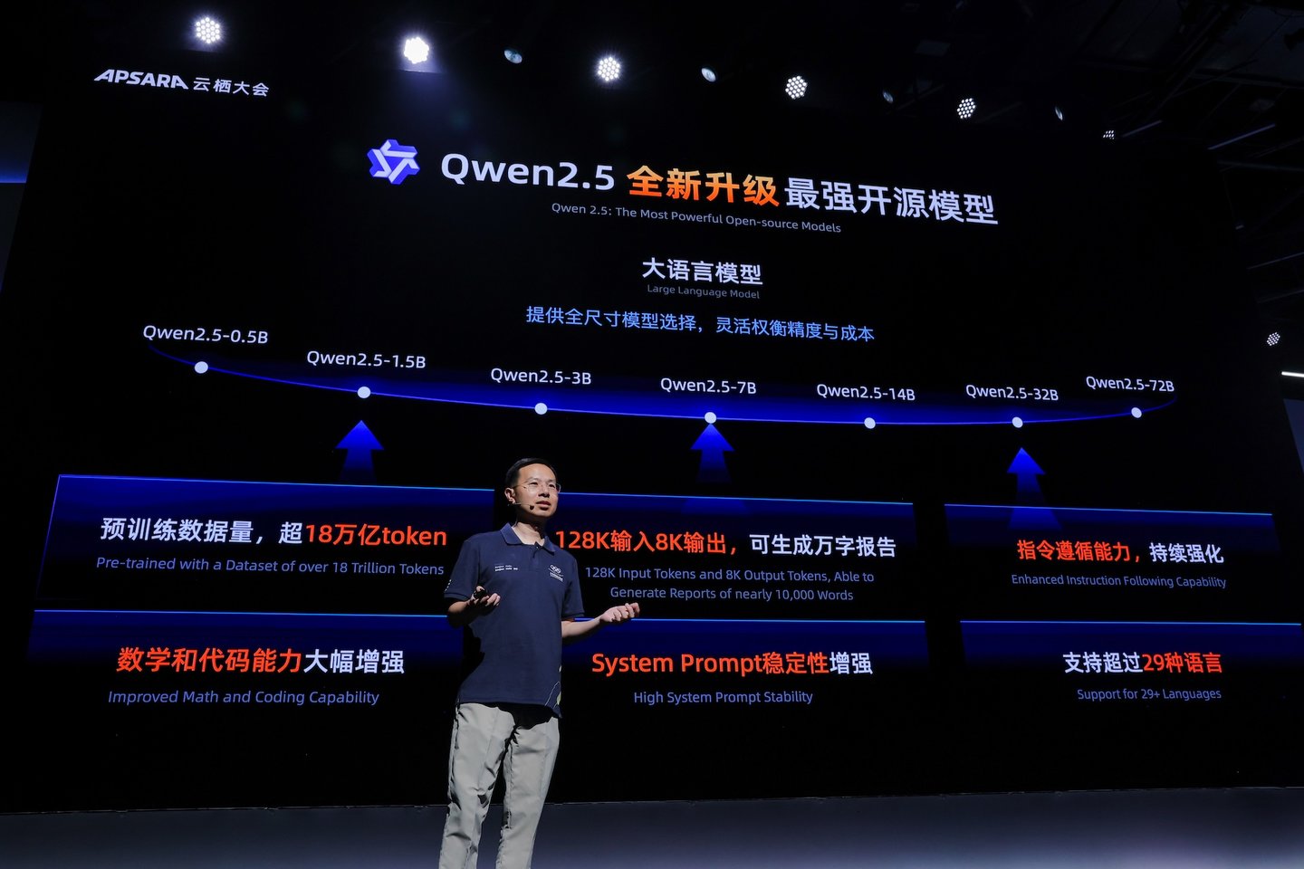 9月,在2024年云栖大会上,阿里云发布了更为强大的Qwen2.5系列,该系列覆盖了从0.5B到72B的不同参数规模的语言模型,可适应不同复杂度的任务及应用场景需求;并推出了针对编程的Qwen2.5-Coder和针对数学的Qwen2.5-Math模型。其中旗舰模型Qwen2.5-72B性能超越Lama 405B。