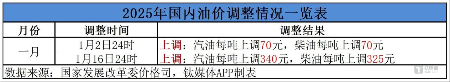 2025年1月16日,国家发展改革委价格司发布公告,根据近期国际市场油价变化情况,按照现行成品油价格形成机制,自1月16日24时起,国内汽、柴油价格(标准品)每吨分别上调340元/吨和325元/吨。