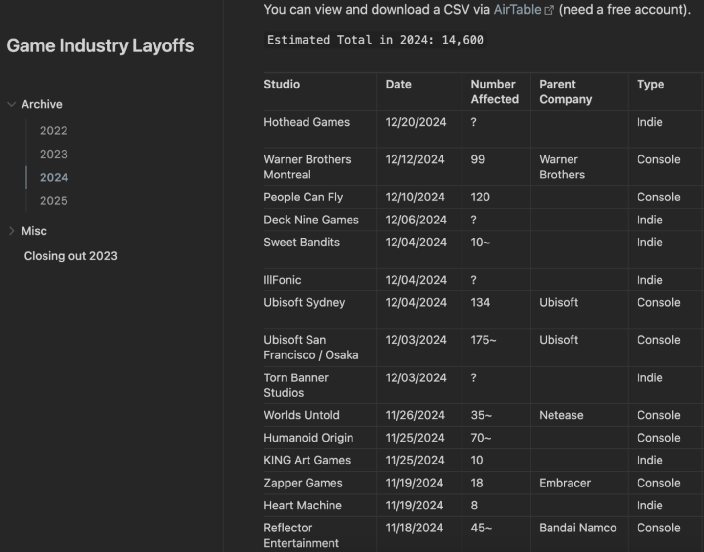 14600代表人数——据游戏行业裁员追踪网站Videogamelayoffs统计,2024年有14600名游戏从业者被迫离开工作岗位。