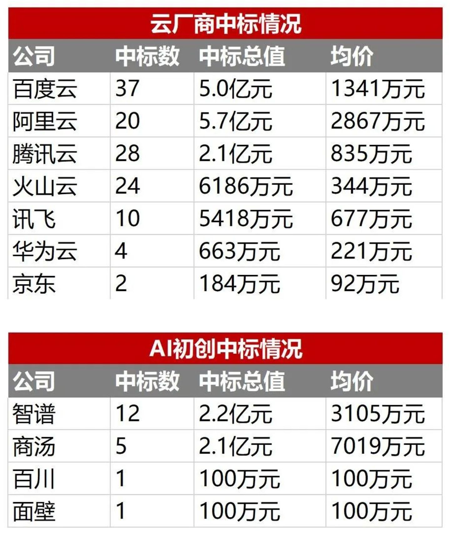 但细究下来,腾讯云共计中标28个,金额总计2.1亿元;阿里云中标20,共计中标5.7亿亿元;百度云中标37个,共计拿下5亿元的单子;火山云中标24个,但总金额只有6186万元。
