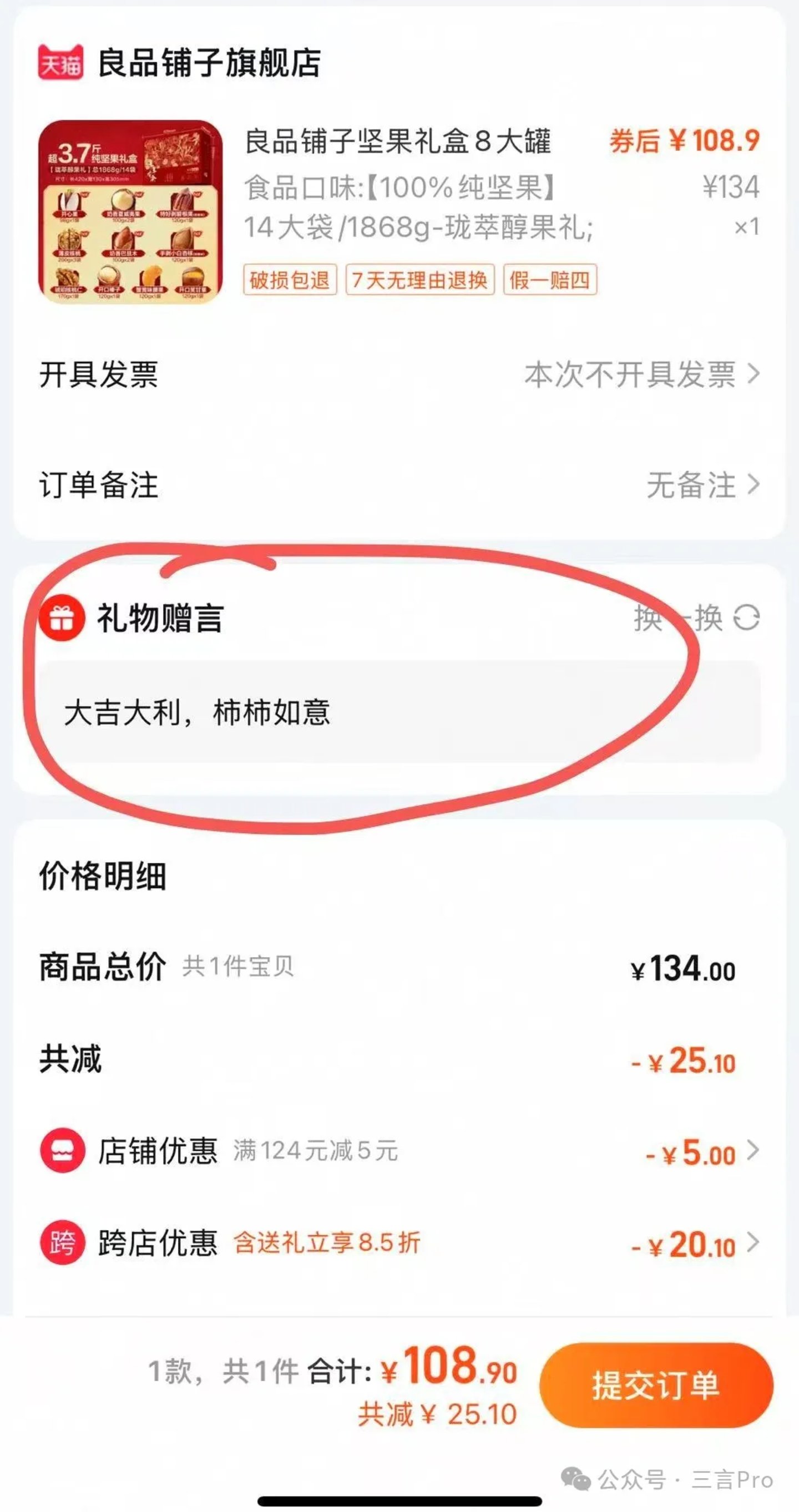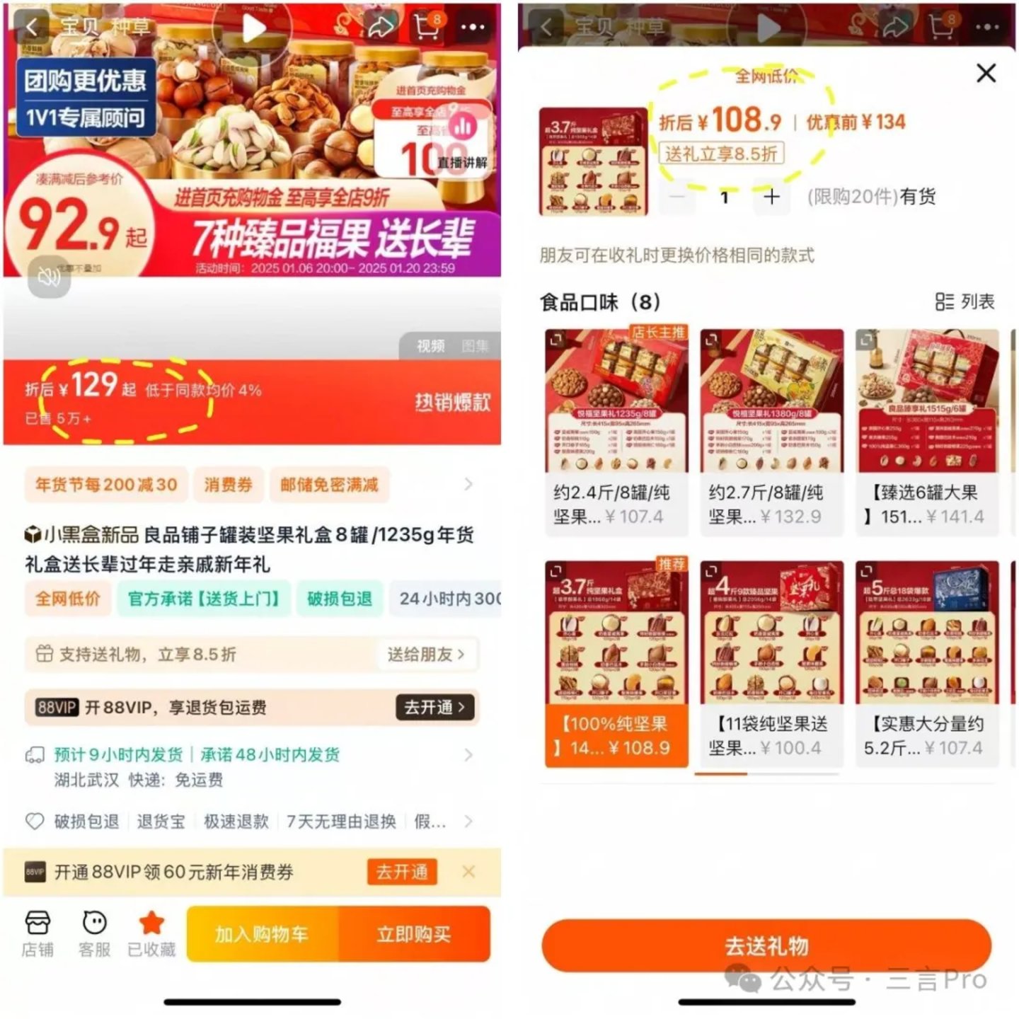 以坚果礼盒为例,正常购物价129元,通过送礼会8.5折优惠到108元,用户直接能够看到价格变化,不需要计算,直观醒目。