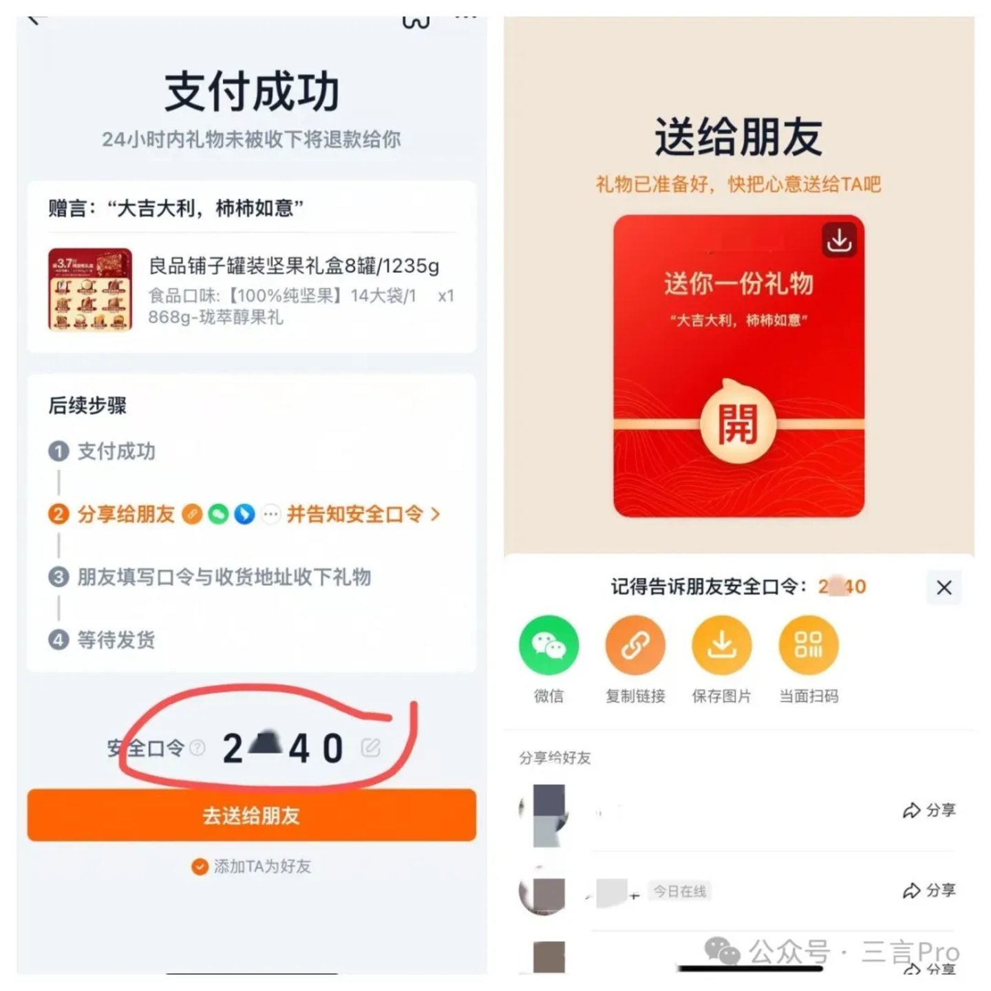 分享方面,“安全码+淘口令”机制,不受关系链限制,可以通过各种社交平台分享给所有你想送礼的朋友。