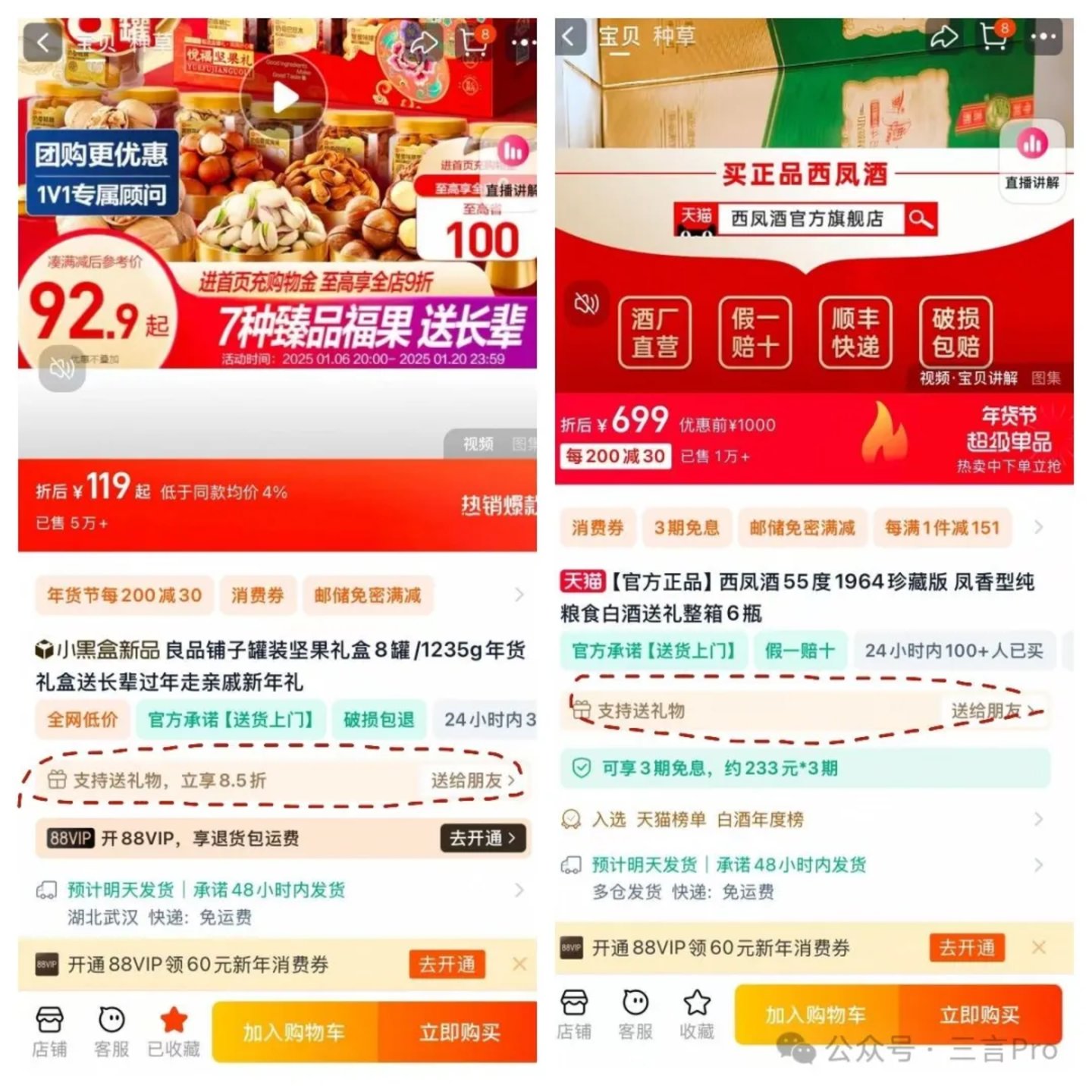 三言实际体验发现,除了部分百亿补贴商品、进口商品以及天猫超市外,基本大部分商品都支持送礼。