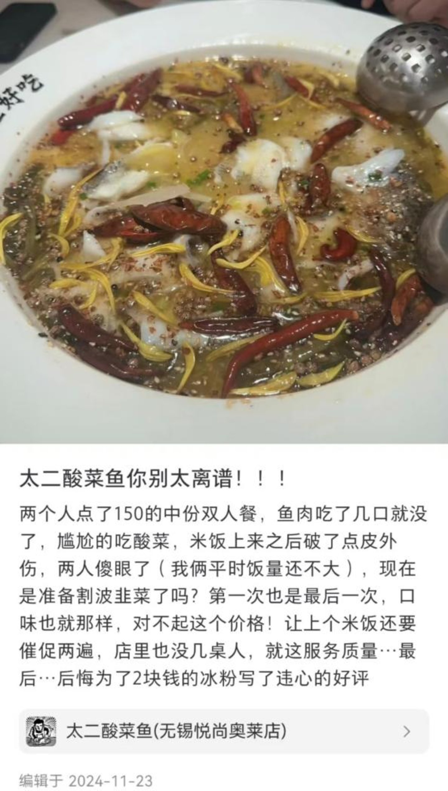 这两年,随着价格战愈演愈烈,太二酸菜鱼的口碑也受到了影响,质量和服务似乎也在大打折扣。在社交平台上,不少消费者反映太二酸菜鱼的份量少,以及服务差。一位小红书网友表示,150元的双人餐,鱼肉吃了几口就没了。
