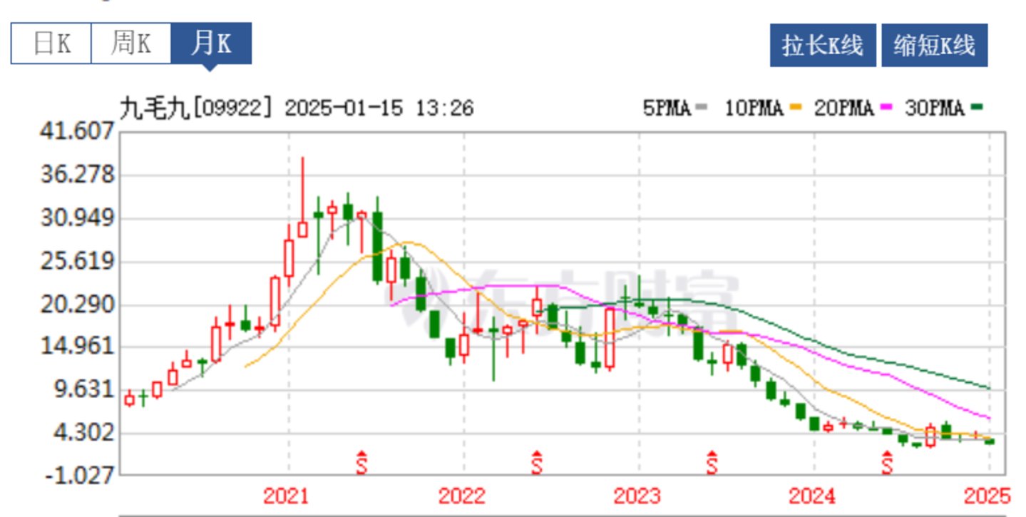 跌跌不休,正是太二酸菜鱼母公司九毛九近年来的真实写照。进入2025年,短短几个交易日,九毛九股价已经跌近20%(截至1月15日收盘)。时间拉长到过去两年,九毛九的股价已经累计下跌超过80%。以此来看,资本市场对九毛九的前景已达到极度悲观的状态。