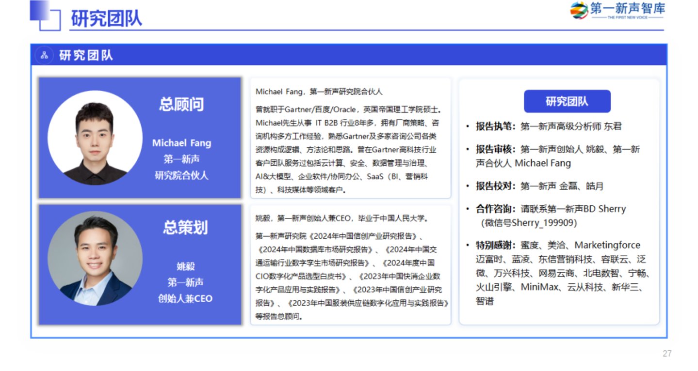 在报告编制过程中,第一新声研究院获得了众多企业和专家的问卷反馈、访谈与建议,并得到他们的大力支持。特此感谢蜜度、美洽、Marketingforce迈富时、蓝凌、东信营销科技、容联云、泛微、万兴科技、网易云商、北电数智、宁畅、火山引擎、MiniMax、云从科技、新华三、智谱等多家企业的高管和专家顾问所提供的宝贵意见与帮助。