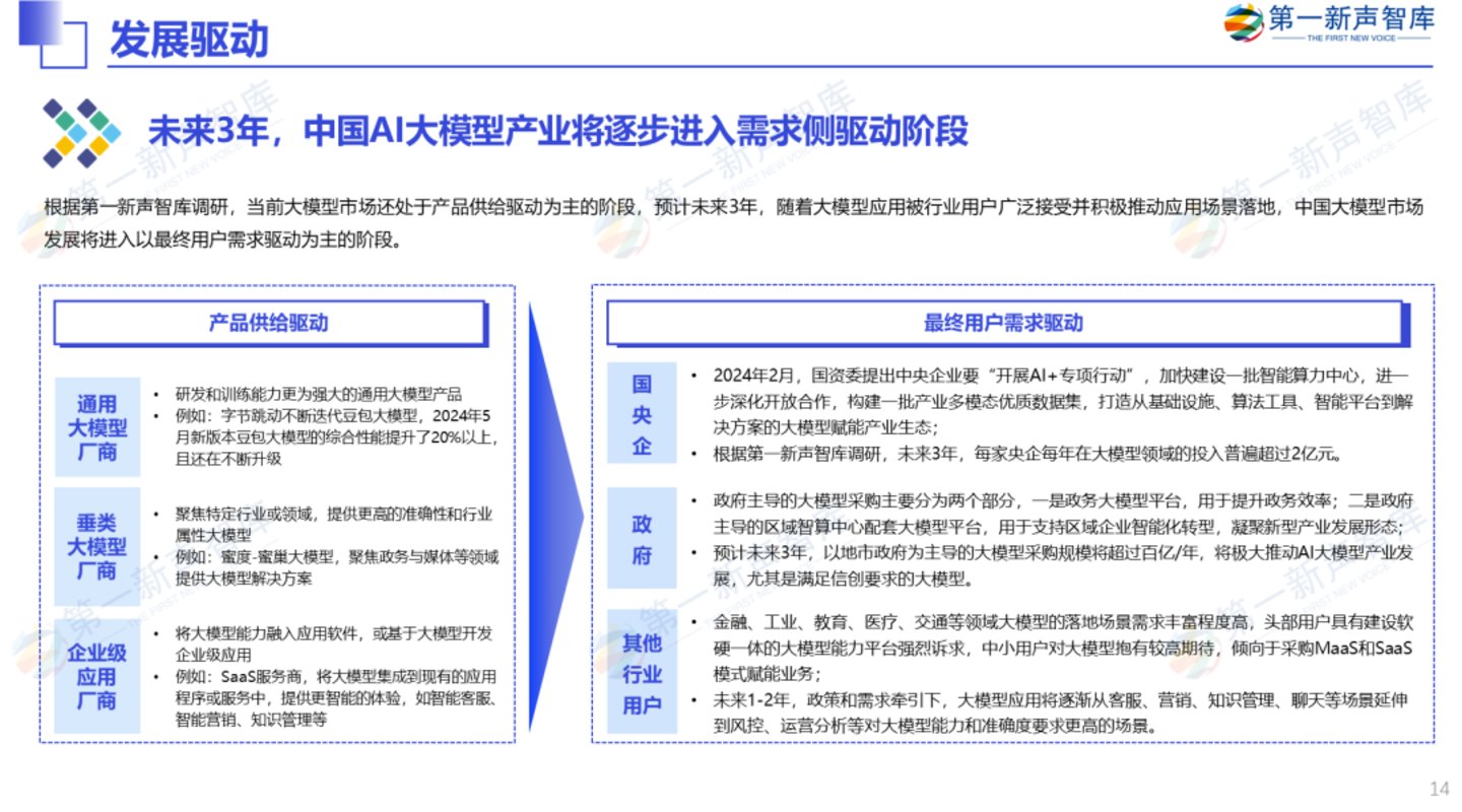 重点分析AI大模型产业的市场规模、发展驱动、市场应用、发展趋势,帮助AI大模型企业把握市场需求动向和发展趋势;
