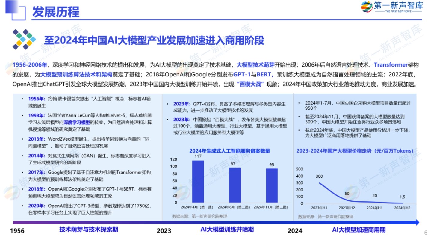 2018年,OpenAI发布第一个生成式预训练模型GPT-1,模型参数量达到1.17亿, 开启了AI大模型的训练热潮;2022年底,ChatGPT的火爆,吸引了全世界对大模型的广泛关注,也激发了中国AI大模型发展热潮。2023年3月中旬,百度发布大语言模型产品文心一言,拉开了国内AI大模型产业 “百模大战”的序幕,之后通义千问、盘古大模型、星火认知大模型、360智脑、豆包等纷纷问世。2024年中国AI大模型产业落地明显加速,AI大模型产品化、商业化和产业化的发展脉络基本形成。