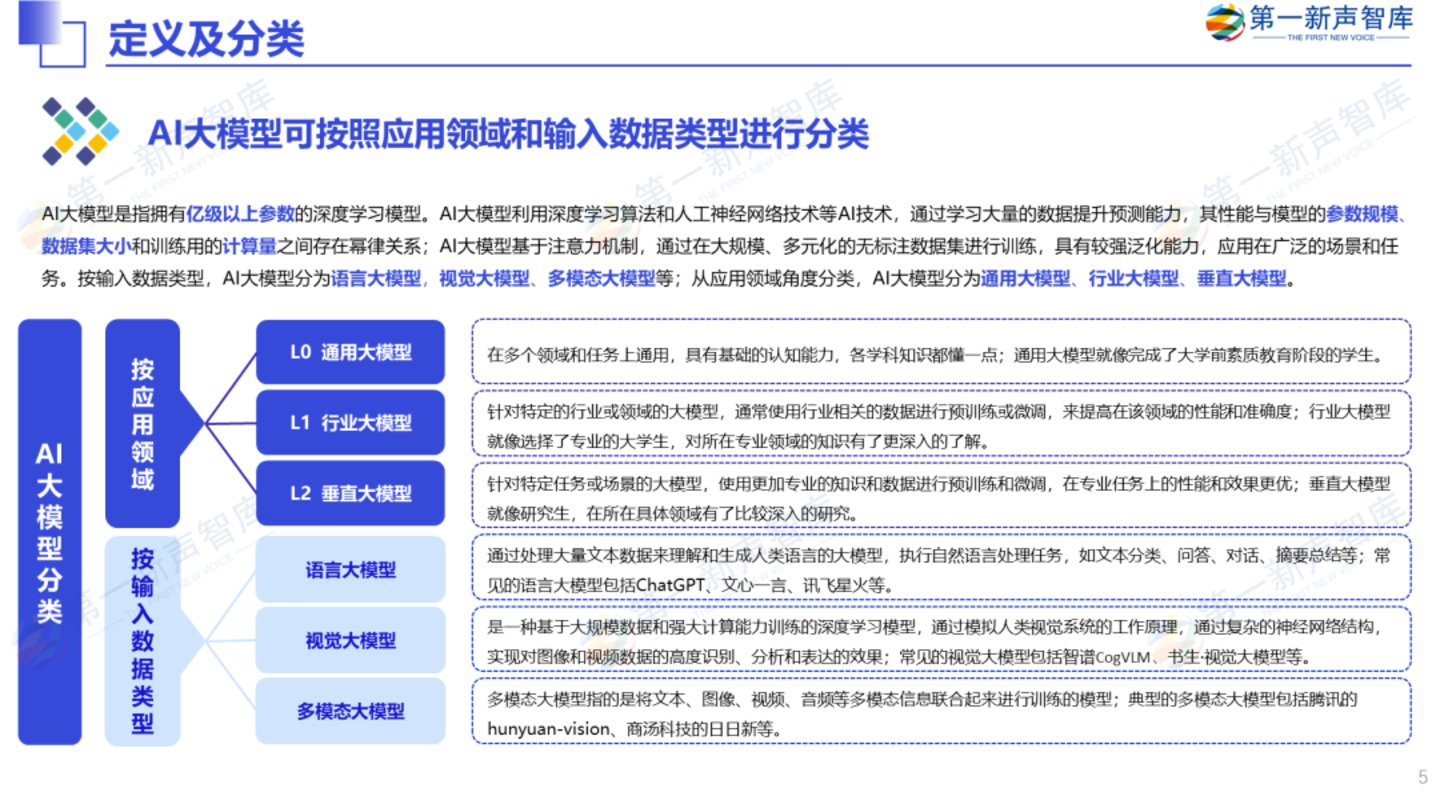 AI大模型是指拥有亿级以上参数的深度学习模型,从应用场景角度可分为通用大模型和垂直大模型,其中垂直大模型又可以分为行业大模型和垂直场景大模型。通用大模型,聚焦基础层和技术攻关;垂直大模型,聚焦垂直领域解决方案,在通用大模型基础上开发行业和场景专用模型,面向政务、金融、医疗、教育、交通等垂直行业和营销、客服、运营等通用场景。