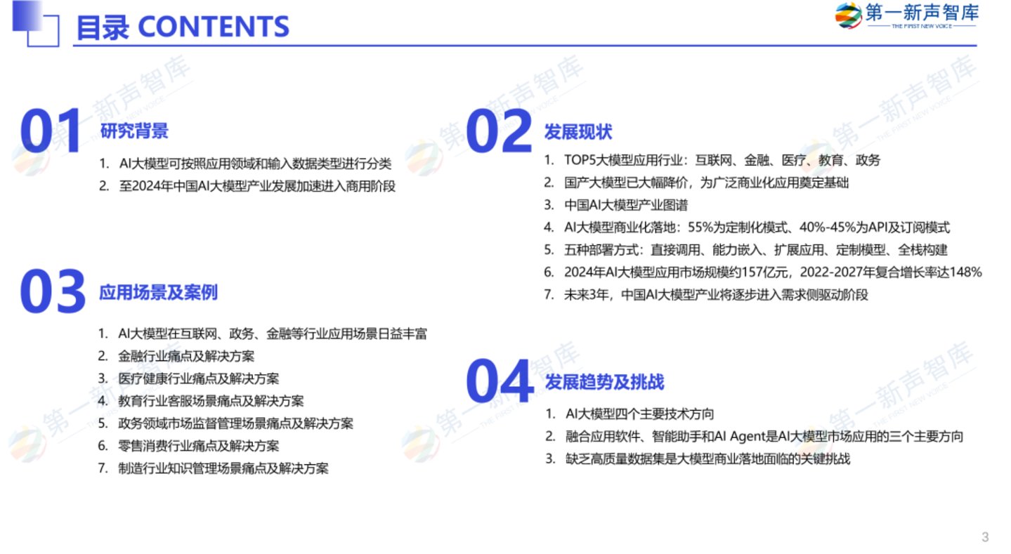 2024年以来,我国AI大模型的产业应用已经迅速展开,本报告通过调研中国AI大模型产业发展和市场应用,梳理AI大模型的发展历程、产业生态、商业模式、行业应用、市场规模、发展趋势等,并对典型垂类行业和场景应用案例进行剖析,以期达到以下目的: