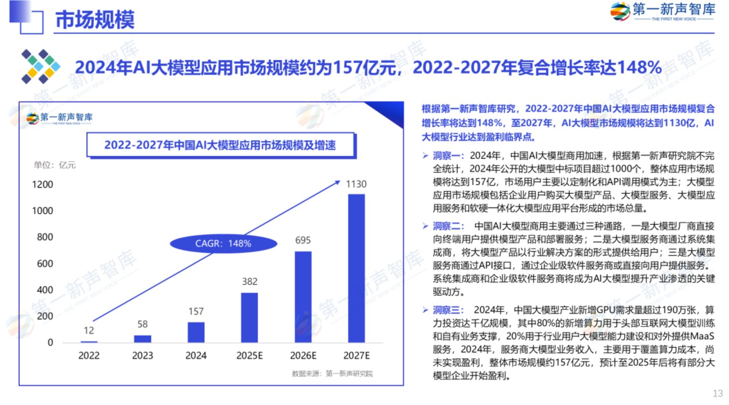2024年AI大模型应用市场规模约为157亿元,2022-2027年复合增长率达148%