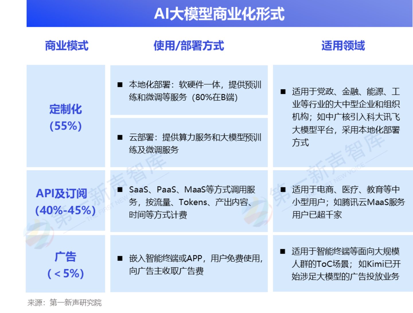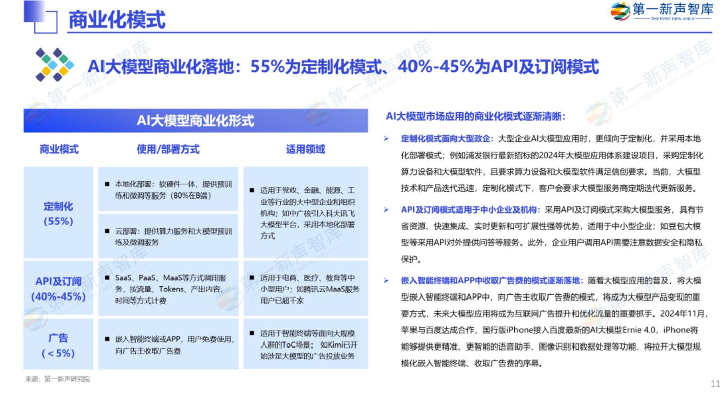 AI大模型商业化落地:55%为定制化模式、40%-45%为API及订阅模式