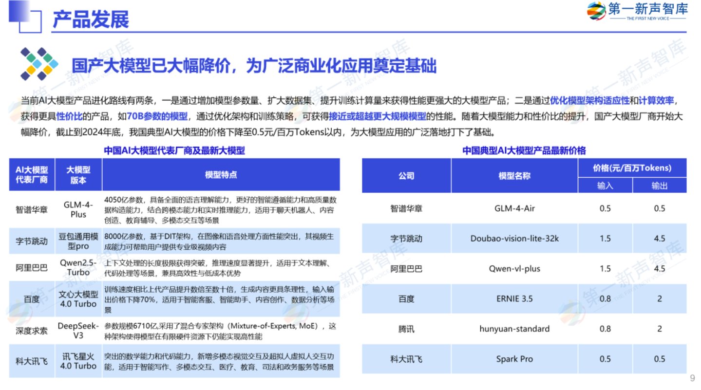 国产大模型已大幅降价,为广泛商业化应用奠定基础;当前AI大模型产品进化路线有两条,一是通过增加模型参数量、扩大数据集、提升训练计算量来获得性能更强大的大模型产品;二是通过优化模型架构适应性和计算效率,获得更具性价比的产品,如70B参数的模型,通过优化架构和训练策略,可获得接近或超越更大规模模型的性能。随着大模型能力和性价比的提升,国产大模型厂商开始大幅降价,截止到2024年底,我国典型AI大模型的价格下降至0.5元/百万Tokens以内,为大模型应用的广泛落地打下了基础。